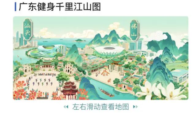 在“廣東健身地圖”首頁,用戶可以通過以走馬燈形式輪播的廣東21城體育性格海報,以及近期大火的廣東體育“千里江山圖”便捷直達當?shù)伢w育場館列表。與此同時,頁面上還集成了廣東21城體育性格的全媒體報道,將體育性格與體育場館進行融合展示。依托制作方南方日報、南方+的媒體資源,“廣東健身地圖”還將提供新鮮豐富的體育日常資訊。
