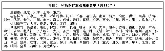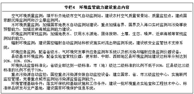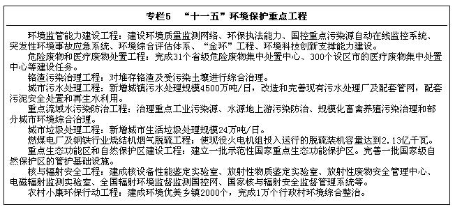(二)投資重點。 為實現(xiàn)“十一五”環(huán)境保護目標(biāo),全國環(huán)保投資約需占同期國內(nèi)生產(chǎn)總值的1.35%。 1.水污染治理。 為實現(xiàn)化學(xué)需氧量減少10%的目標(biāo),必須通過工程措施削減化學(xué)需氧量400萬噸,其中:需新增城市污水處理能力4500萬噸/日,形成化學(xué)需氧量削減能力300萬噸;工業(yè)污水治理削減化學(xué)需氧量100萬噸。水污染治理是投資的重中之重。 2.大氣污染治理。 為實現(xiàn)二氧化硫排放量減少10%的目標(biāo),在“十一五”新建燃煤電廠基本都安裝脫硫設(shè)施的前提下,還必須通過工程措施削減現(xiàn)役火電機組二氧化硫490萬噸,使現(xiàn)役火電機組投入運行的脫硫裝機容量達到2.13億千瓦,鋼鐵燒結(jié)機煙氣脫硫等脫硫工程形成脫硫能力30萬噸。推進其他工業(yè)廢氣治理、城市集中供熱、集中供氣等大氣污染綜合治理。 3.固體廢物治理。 繼續(xù)實施危險廢物和醫(yī)療廢物處理設(shè)施建設(shè)規(guī)劃,新增城市生活垃圾無害化處理能力24萬噸/日,推進工業(yè)固體廢物、廢舊家電處置與綜合利用等固體廢物治理。 4.核安全與放射性廢物治理。 重點建設(shè)退役核設(shè)施與中低放射性廢物處理處置、鈾礦開采的污染防治等設(shè)施。 5.農(nóng)村污染治理與生態(tài)保護。 實施農(nóng)村小康環(huán)保行動計劃,啟動農(nóng)村環(huán)境治理,開展土壤污染調(diào)查與修復(fù),強化重點生態(tài)功能保護區(qū)和自然保護區(qū)建設(shè)。 6.能力建設(shè)。 建設(shè)先進的環(huán)境監(jiān)測預(yù)警體系、完備的環(huán)境執(zhí)法監(jiān)督體系,增強環(huán)保科技與產(chǎn)業(yè)支撐能力。 (三)投資來源。 1.政府投資。 環(huán)境基礎(chǔ)設(shè)施建設(shè)、重點流域綜合治理、核與輻射安全、農(nóng)村污染治理、自然保護區(qū)和重要生態(tài)功能區(qū)建設(shè)、環(huán)境監(jiān)管能力建設(shè)等,主要以地方各級人民政府投入為主,中央政府區(qū)別不同情況給予支持。 2.企業(yè)投資。 工業(yè)污染治理按照“污染者負(fù)責(zé)”原則,由企業(yè)負(fù)責(zé)。其中現(xiàn)有污染源治理投資由企業(yè)利用自有資金或銀行貸款解決。新擴改建項目環(huán)保投資,要納入建設(shè)項目投資計劃。 要積極利用市場機制,吸引社會投資,形成多元化的投入格局?!笆晃濉逼陂g預(yù)計可征收排污費750億元,用于污染治理,以補助或者貼息方式,吸引銀行特別是政策性銀行,積極支持環(huán)境保護項目。 五、保障措施 積極推進歷史性轉(zhuǎn)變,著力克服長期制約環(huán)境保護發(fā)展的制度性障礙,加大改革創(chuàng)新力度,完善體制,創(chuàng)新機制,加強法制,增加投入,提高環(huán)境保護工作水平。 (一)促進區(qū)域經(jīng)濟與環(huán)境協(xié)調(diào)發(fā)展。 實施區(qū)域發(fā)展總體戰(zhàn)略,將國土空間劃分為四類主體功能區(qū),既是優(yōu)化經(jīng)濟布局、促進區(qū)域協(xié)調(diào)發(fā)展的戰(zhàn)略舉措,更是保護生態(tài)環(huán)境的一項基礎(chǔ)性、長遠(yuǎn)性的根本措施,也為強化國家在環(huán)境保護領(lǐng)域的宏觀調(diào)控和分類指導(dǎo)提供了依據(jù)。 1.加強地區(qū)分類指導(dǎo)。 在國家區(qū)域協(xié)調(diào)發(fā)展戰(zhàn)略框架下,西部地區(qū)要強化生態(tài)保護,依據(jù)國家政策和規(guī)劃,穩(wěn)步實施生態(tài)退耕,繼續(xù)推進各類生態(tài)建設(shè)工程,建設(shè)重點生態(tài)功能保護區(qū),加大荒漠化和石漠化治理力度,加強資源開發(fā)活動的環(huán)境監(jiān)管,控制和防止重化工業(yè)和資源開發(fā)過程中的污染和生態(tài)破壞,加強三峽庫區(qū)及其上游、黃河中上游等重點流域水污染與水土流失防治;東北地區(qū)要加強黑土地水土流失和東北西部荒漠化綜合治理,加大資源枯竭型城市和礦山的生態(tài)修復(fù),推進松花江、遼河、鴨綠江等流域和界河的污染治理,加快生態(tài)省和循環(huán)經(jīng)濟試點省建設(shè)步伐;中部地區(qū)要加快環(huán)境基礎(chǔ)設(shè)施建設(shè),加大重點流域的水污染治理力度,有效維護區(qū)域資源環(huán)境承載能力,嚴(yán)格控制污染物排放總量;東部地區(qū)要率先推進歷史性轉(zhuǎn)變,率先還清舊賬,加快產(chǎn)業(yè)結(jié)構(gòu)優(yōu)化升級,促進增長方式的轉(zhuǎn)變,加大長三角、珠三角、京津冀等沿海城市群區(qū)域環(huán)境綜合整治力度,大幅度削減主要污染物排放總量。 2.逐步實行環(huán)境分類管理。 按照全國主體功能區(qū)劃的要求,對四類主體功能區(qū)制定分類管理的環(huán)境政策和評價指標(biāo)體系,逐步實行分類管理。 在優(yōu)化開發(fā)區(qū)域,堅持環(huán)境優(yōu)先,優(yōu)化產(chǎn)業(yè)結(jié)構(gòu)和布局,大力發(fā)展高新技術(shù),加快傳統(tǒng)產(chǎn)業(yè)技術(shù)升級,實行嚴(yán)格的建設(shè)項目環(huán)境準(zhǔn)入制度,率先完成排污總量削減任務(wù),做到增產(chǎn)減污,解決一批突出的環(huán)境問題,改善環(huán)境質(zhì)量。 在重點開發(fā)區(qū)域,堅持環(huán)境與經(jīng)濟協(xié)調(diào)發(fā)展,科學(xué)合理利用環(huán)境承載力,推進工業(yè)化和城鎮(zhèn)化,加快環(huán)保基礎(chǔ)設(shè)施建設(shè),