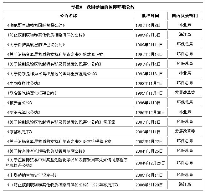 (七)動員社會力量保護環(huán)境。 開展各類環(huán)境宣傳教育活動,實行環(huán)境信息公開,動員社會各界力量參與環(huán)境保護。 1.增強全社會生態(tài)文明意識。 不斷增強各級干部和廣大群眾的環(huán)境意識和法制觀念,重點加強對領(lǐng)導(dǎo)干部的環(huán)境教育和培訓(xùn)。充分發(fā)揮輿論引導(dǎo)和監(jiān)督作用,大力宣傳環(huán)境保護的方針政策和法律法規(guī),公開曝光環(huán)境違法行為。抓好環(huán)?;A(chǔ)教育、專業(yè)教育、社會教育和崗位培訓(xùn)。全方位、多層次推廣適應(yīng)建立資源節(jié)約型、環(huán)境友好型社會要求的生產(chǎn)生活方式。 2.?dāng)U大公眾環(huán)境知情權(quán)。 推行政務(wù)公開,實行環(huán)境保護政策法規(guī)、項目審批、案件處理等政務(wù)公告公示制度。完善環(huán)境信息政府網(wǎng)站,公開發(fā)布環(huán)境質(zhì)量、環(huán)境管理等環(huán)境信息。依法推進企業(yè)環(huán)境信息公開,開展上市公司的環(huán)境績效評估和環(huán)境信息公告。 3.完善公眾參與環(huán)境保護機制。 大力普及環(huán)境科學(xué)知識,實施千鄉(xiāng)萬村環(huán)保科普行動計劃。推廣環(huán)境標(biāo)志和環(huán)境認(rèn)證,倡導(dǎo)綠色消費、綠色辦公和綠色采購,廣泛開展綠色社區(qū)、綠色學(xué)校、綠色家庭等群眾性創(chuàng)建活動,充分發(fā)揮工會、共青團、婦聯(lián)等群眾組織、社區(qū)組織和各類環(huán)保社團及環(huán)保志愿者的作用。加強信訪工作,充分發(fā)揮12369環(huán)保熱線的作用,拓寬和暢通群眾舉報投訴渠道。開展環(huán)境公益訴訟研究,加強行政復(fù)議,推動行政訴訟,依法維護公民環(huán)境權(quán)益。完善公眾參與的規(guī)則和程序,采用聽證會、論證會、社會公示等形式,聽取公眾意見,接受群眾監(jiān)督,實行民主決策。 ?。ò耍┓e極開展環(huán)境保護國際合作。 把環(huán)境保護作為我國對外開放的重要領(lǐng)域,繼續(xù)擴大對外開放,在國際環(huán)境事務(wù)中發(fā)揮更加積極的作用。 1.積極參與全球環(huán)境保護。 堅持“共同但有區(qū)別的責(zé)任”原則,積極參與國際環(huán)境公約和世貿(mào)組織環(huán)境與貿(mào)易談判,維護我國和廣大發(fā)展中國家環(huán)境權(quán)益。履行相應(yīng)國際義務(wù),大力推進國內(nèi)履約工作,加快消耗臭氧層物質(zhì)的淘汰進程,努力控制溫室氣體排放。