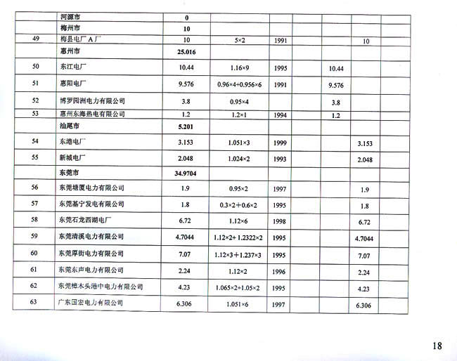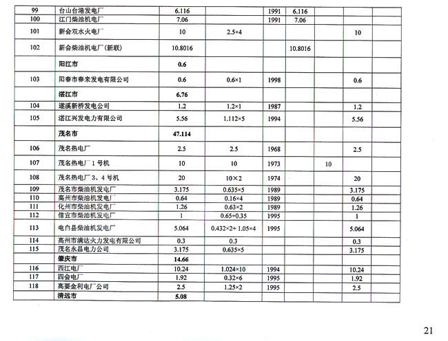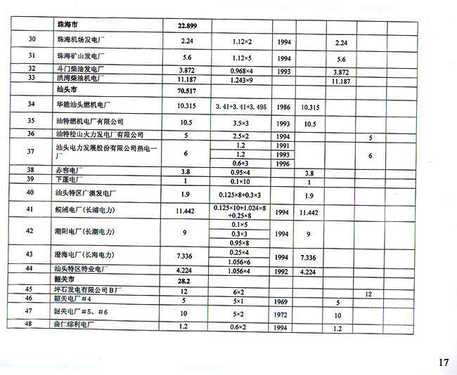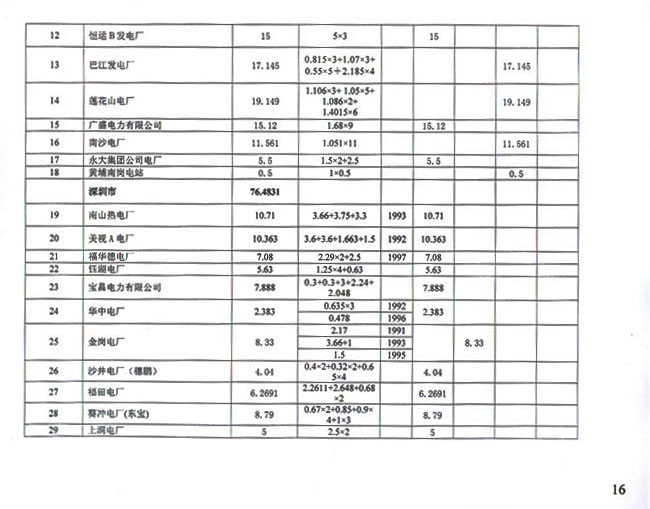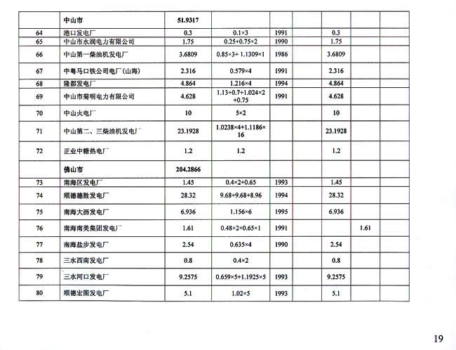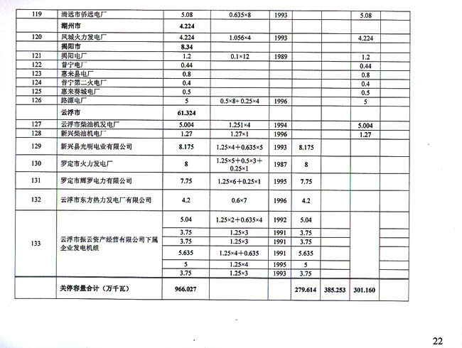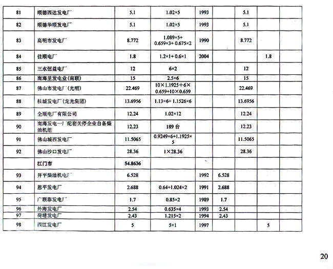 注:本表所列關(guān)停機(jī)組包括四個部分:一是國家發(fā)展改革委與省政府簽訂的廣東省“十一五”期間關(guān)停小火電機(jī)組責(zé)任書中的機(jī)組。經(jīng)進(jìn)一步核實(shí),該責(zé)任書中,中山小欖發(fā)電廠與中山市菊明電力有限公司系同一項(xiàng)目;永寧發(fā)電廠與中山市永潤電力有限公司系同一項(xiàng)目;江門發(fā)電廠與江門柴油機(jī)廠系同一項(xiàng)目,屬重復(fù)計(jì)算。鑒此,本表中相應(yīng)剔除了前者,共計(jì)調(diào)減容量8.38萬千瓦。二是補(bǔ)列已經(jīng)納入“上大壓小”電源項(xiàng)目配套關(guān)停但未列入責(zé)任書的中山市正業(yè)中糖熱電廠1.2萬千瓦。三是核實(shí)機(jī)組銘牌容量后調(diào)增容量4.3萬千瓦。四是根據(jù)佛山市、省粵電集團(tuán)公司提出增加關(guān)停小火電機(jī)組規(guī)模、相應(yīng)實(shí)施“上大壓小”電源項(xiàng)目建設(shè)的要求,增加關(guān)停佛山市的佛山沙口發(fā)電廠28.36萬千瓦、佛山城西發(fā)電廠11.14萬千瓦;茂名市的茂名熱電廠#1、#3、#4號機(jī)(3×10萬千瓦),合計(jì)增加容量69.5萬千瓦。經(jīng)上述調(diào)整之后,全省“十一五”期間關(guān)停火電機(jī)組總?cè)萘繛?66萬千瓦。