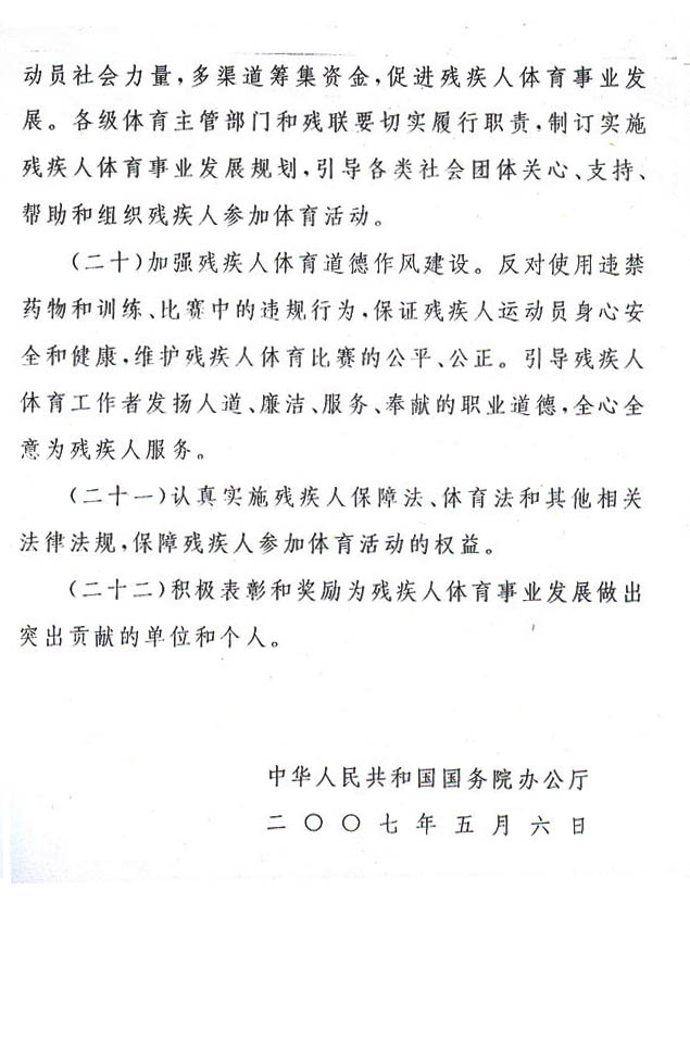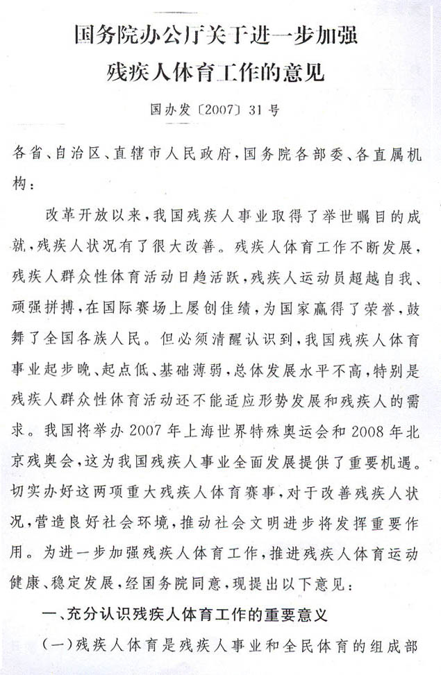 現(xiàn)將《國務(wù)院辦公廳關(guān)于進(jìn)一步加強(qiáng)殘疾人體育工作的意見》(國辦發(fā)〔2007〕31號)轉(zhuǎn)發(fā)給你們,請認(rèn)真貫徹執(zhí)行。