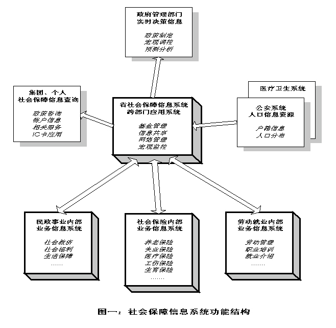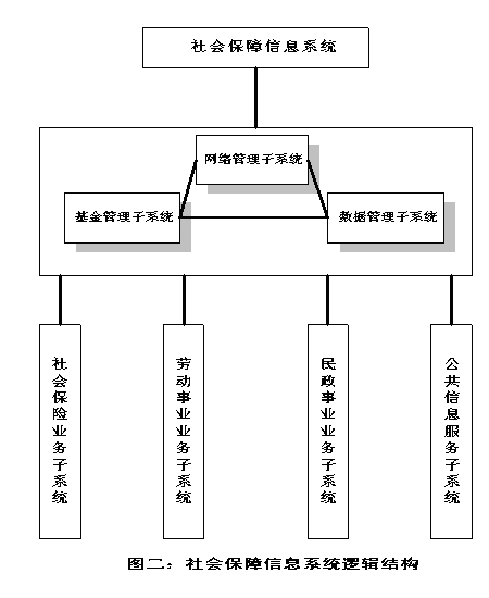?。ǘ┫到y(tǒng)邏輯結(jié)構(gòu) 社會(huì)保障信息系統(tǒng)在縱向上有省、地市和縣三級(jí),橫向上在省、地市級(jí)是以 基金管理子系統(tǒng)、網(wǎng)絡(luò)管理子系統(tǒng)、數(shù)據(jù)管理子系統(tǒng)為核心,并與三大業(yè)務(wù)系統(tǒng) 相連接。另外,還有面向社會(huì)公共信息服務(wù)子系統(tǒng)。在縣級(jí)重點(diǎn)是建設(shè)各個(gè)業(yè)務(wù) 子系統(tǒng),并通過網(wǎng)絡(luò)中心與地市級(jí)連接。系統(tǒng)的邏輯結(jié)構(gòu)如圖二所示。 |