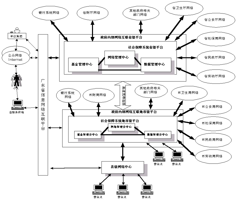 ?。ㄋ模┫到y(tǒng)網(wǎng)絡(luò)結(jié)構(gòu) 社會(huì)保障信息系統(tǒng)的網(wǎng)絡(luò)以我省建立的全省統(tǒng)一網(wǎng)絡(luò)互聯(lián)大平臺(tái)為基礎(chǔ),在 省、市級(jí)分別以政府信息網(wǎng)絡(luò)平臺(tái)為核心,通過公共通信設(shè)施連接到各有關(guān)部門。 在公共服務(wù)方面,充分利用各個(gè)公眾信息網(wǎng)絡(luò)和INTERNET資源。網(wǎng)絡(luò)結(jié) 構(gòu)如圖四所示。 |