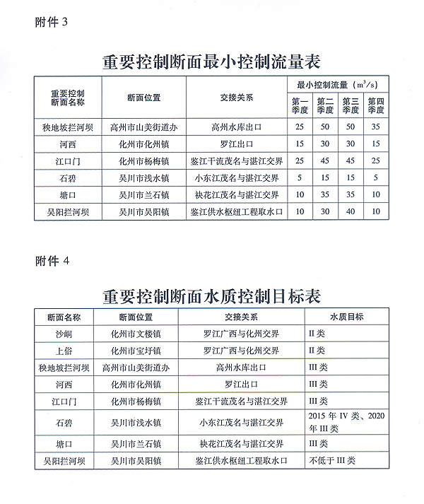 (三)分配總體要求。在確保河道內(nèi)生態(tài)基本需水、全面節(jié)水和充分利用非常規(guī)水源的前提下,以廣東省境內(nèi)鑒江流域水資源可分配量為對象,按照防洪、供水、發(fā)電的順序優(yōu)化水庫、梯級群調(diào)度,確定正常來水年(來水保證率90%以下)和特枯來水年(來水保證率在90%-95%之間,不含90%)情況下茂名和湛江兩市取水量分配指標(biāo);以落實(shí)水資源分配方案、協(xié)調(diào)河道內(nèi)外用水、保障供水安全為目標(biāo),確定重要控制斷面最小下泄流量指標(biāo);以水功能區(qū)水質(zhì)達(dá)標(biāo)為目的,確定各控制斷面水質(zhì)管理控制指標(biāo)。