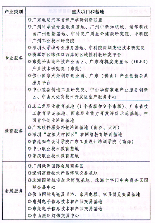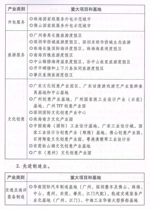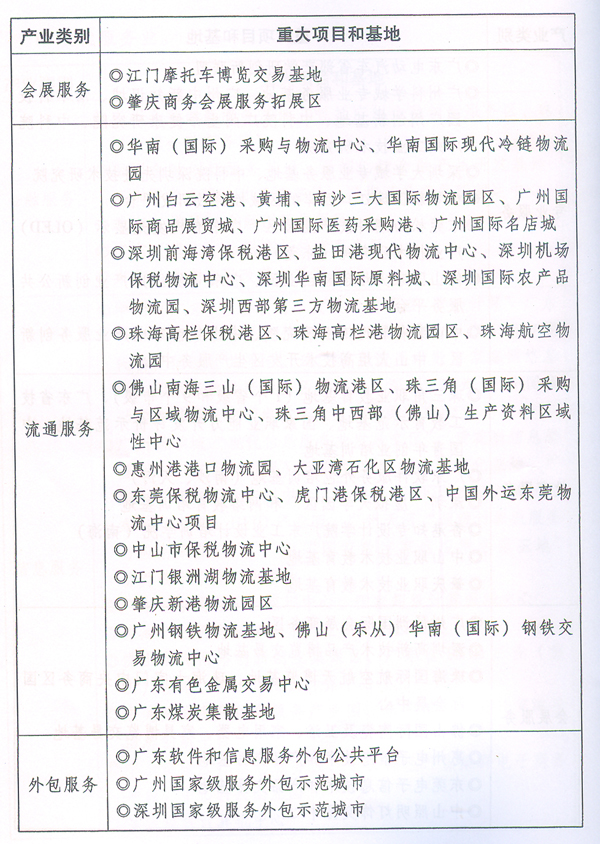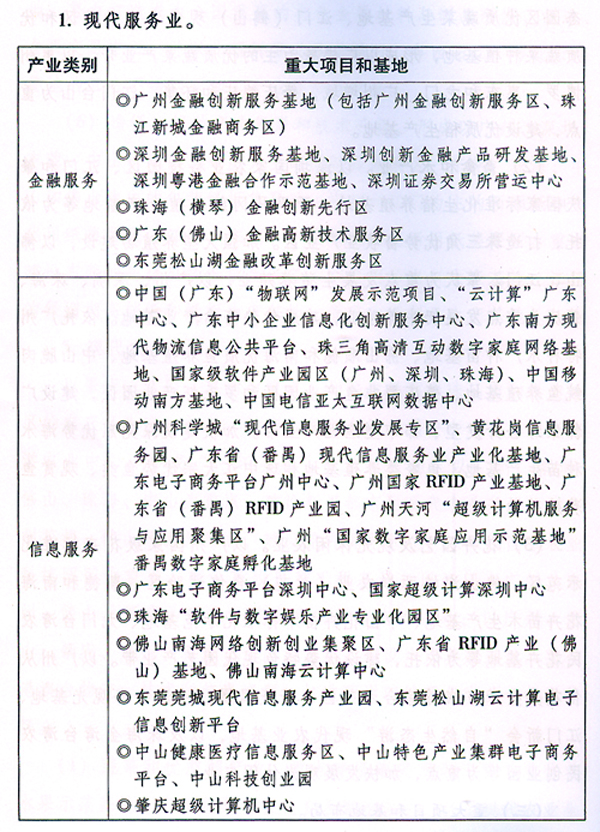 以知識化和高端化為取向,全面實施《粵港合作框架協(xié)議》,加強合作和引進,引導現(xiàn)代服務業(yè)向中心城市集聚,大力發(fā)展金融服務、信息服務、專業(yè)服務、教育服務、會展服務、流通服務、外包服務、旅游服務及文化創(chuàng)意等產(chǎn)業(yè),加快總部經(jīng)濟發(fā)展,推進商業(yè)模式創(chuàng)新,把珠三角建設成為國際航運、物流、信息、貿(mào)易、會展、旅游和創(chuàng)新中心,成為具有較強國際競爭力的世界高端服務業(yè)基地。