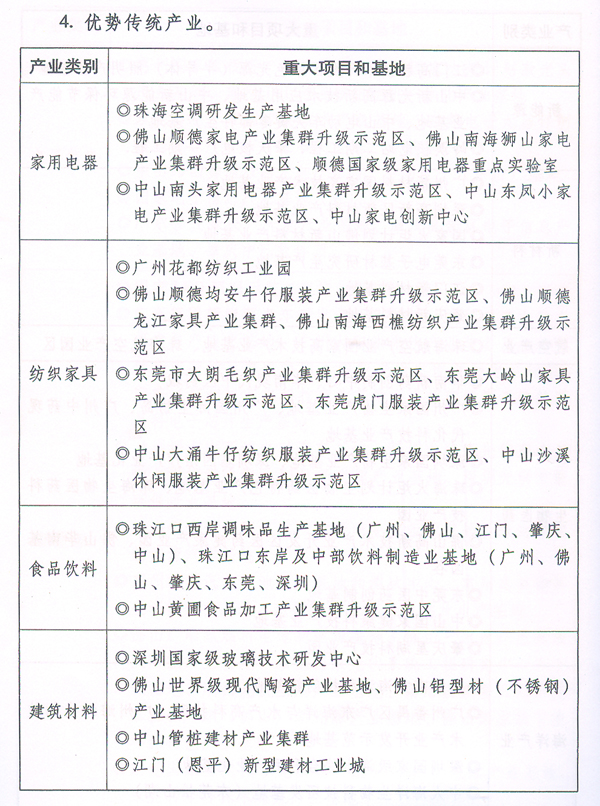 堅持高端發(fā)展的戰(zhàn)略取向,優(yōu)先發(fā)展以生產(chǎn)性服務業(yè)為主體的現(xiàn)代服務業(yè),加快發(fā)展先進制造業(yè),大力發(fā)展戰(zhàn)略性新興產(chǎn)業(yè)和高技術(shù)產(chǎn)業(yè),改造提升優(yōu)勢傳統(tǒng)產(chǎn)業(yè),積極發(fā)展現(xiàn)代農(nóng)業(yè)等5大領域30個重點產(chǎn)業(yè),構(gòu)建布局一體化的珠三角地區(qū)“530”產(chǎn)業(yè)體系。具體見附表二。