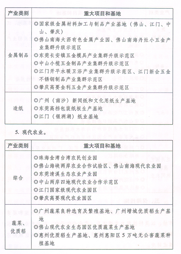 ?。?)蔬菜和優(yōu)質(zhì)稻產(chǎn)業(yè)。重點建設肇慶萬畝優(yōu)質(zhì)供港蔬菜水果示范基地、廣州蔬菜良種選育及繁殖基地、佛山現(xiàn)代農(nóng)業(yè)生態(tài)園區(qū)優(yōu)質(zhì)蔬菜生產(chǎn)基地、江門(鶴山)現(xiàn)代農(nóng)業(yè)示范區(qū)和優(yōu)質(zhì)蔬菜種植基地,形成以廣佛肇為主的優(yōu)質(zhì)蔬菜產(chǎn)業(yè)帶。以惠州博羅、惠東和龍門,廣州增城,肇慶德慶和懷集,江門臺山為重點,建設優(yōu)質(zhì)稻生產(chǎn)基地。