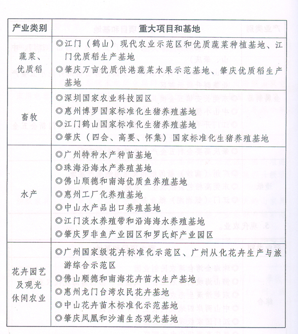 以肇慶、江門、惠州為重點,加快發(fā)展面向珠三角和港澳地區(qū)的農(nóng)產(chǎn)品生產(chǎn)、加工、供應和綠色食品流通中心、生態(tài)觀光旅游農(nóng)業(yè)中心,形成“一環(huán)多點”的總體布局。以廣州、深圳、佛山、珠海、中山為重點,建設新興都市型現(xiàn)代農(nóng)業(yè)基地;以廣州花都、佛山順德為重點,建設花卉觀光基地;以深圳國家農(nóng)業(yè)科技園區(qū)為重點,建設畜牧良種工程基地;以江門、廣州、惠州、佛山及肇慶為重點,建設瘦肉型豬生產(chǎn)基地;以廣州、佛山、肇慶、惠州、珠海、江門為重點,建設水產(chǎn)養(yǎng)殖基地。整合港澳臺物流、技術(shù)和信息資源,打造兩岸四地現(xiàn)代農(nóng)業(yè)合作示范區(qū)。