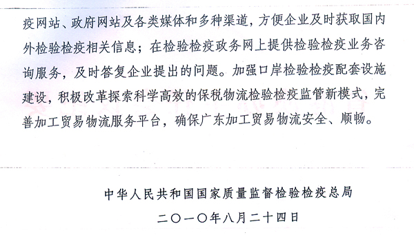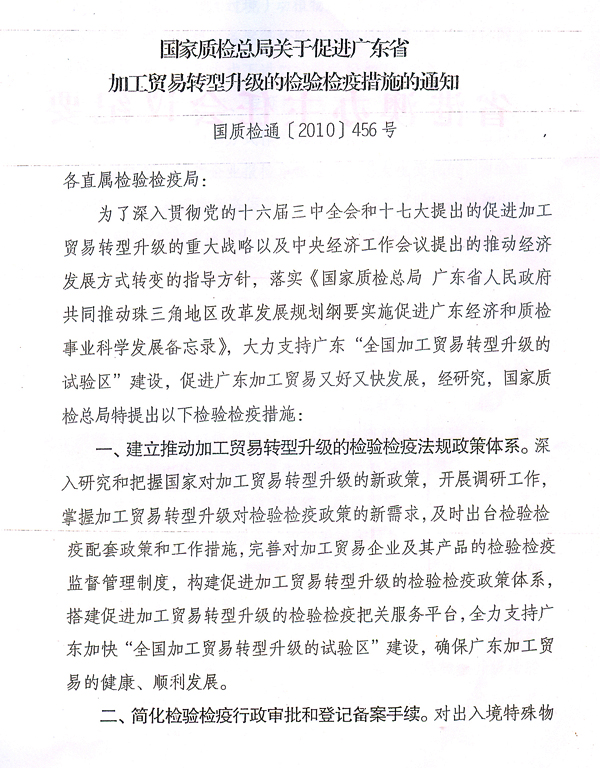 各地級以上市人民政府,省政府各部門、各直屬機(jī)構(gòu): 近日,國家質(zhì)檢總局根據(jù)廣東出入境檢驗(yàn)檢疫局調(diào)研意見,出臺了《國家質(zhì)檢總局關(guān)于促進(jìn)廣東省加工貿(mào)易轉(zhuǎn)型升級的檢驗(yàn)檢疫措施的通知》(國質(zhì)檢通〔2010〕456號),支持我省建設(shè)全國加工貿(mào)易轉(zhuǎn)型升級試驗(yàn)區(qū)。根據(jù)省政府領(lǐng)導(dǎo)意見,現(xiàn)將國質(zhì)檢通〔2010〕456號文轉(zhuǎn)發(fā)給你們,請認(rèn)真組織學(xué)習(xí)宣傳,配合做好相關(guān)工作。同時(shí),各地、各部門要借鑒國家質(zhì)檢總局和廣東出入境檢驗(yàn)檢疫局的做法,積極采取有效措施,為加工貿(mào)易企業(yè)轉(zhuǎn)型升級提供優(yōu)質(zhì)、高效的服務(wù)。