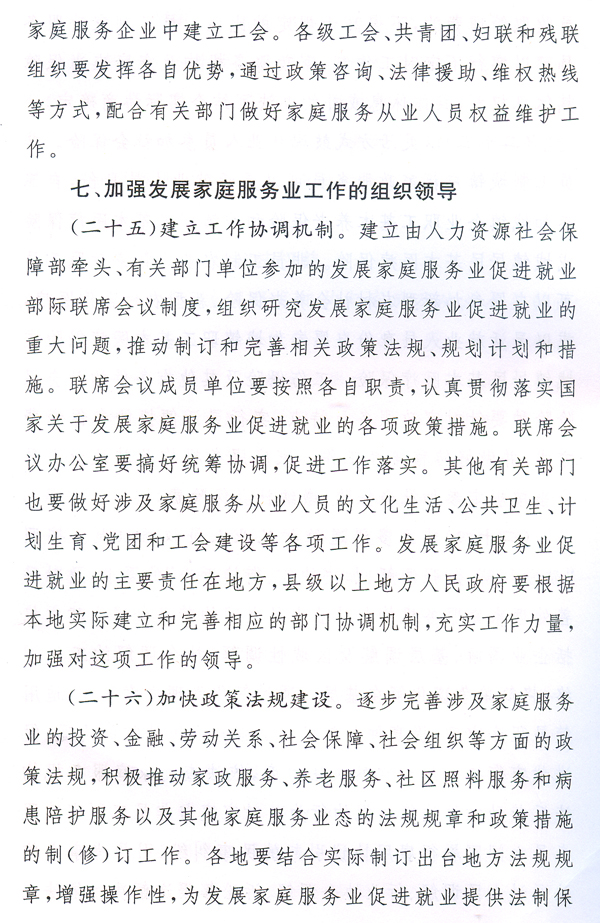 為加強(qiáng)對(duì)全省發(fā)展家庭服務(wù)業(yè)工作的組織領(lǐng)導(dǎo),完善工作協(xié)調(diào)機(jī)制,省人民政府同意建立由省人力資源社會(huì)保障廳牽頭,有關(guān)部門和單位參加的省發(fā)展家庭服務(wù)業(yè)促進(jìn)就業(yè)部門間聯(lián)席會(huì)議制度,負(fù)責(zé)對(duì)全省發(fā)展家庭服務(wù)業(yè)工作進(jìn)行統(tǒng)籌協(xié)調(diào)和督促指導(dǎo)。各地也要抓緊建立相應(yīng)的協(xié)調(diào)機(jī)制,并將有關(guān)情況及時(shí)向省聯(lián)席會(huì)議報(bào)告。