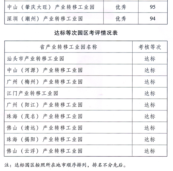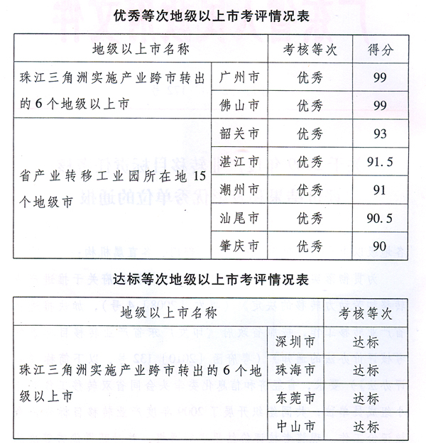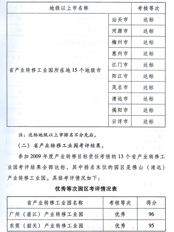各地級(jí)以上市人民政府,省政府各部門(mén)、各直屬機(jī)構(gòu): 為貫徹落實(shí)《中共廣東省委廣東省人民政府關(guān)于推進(jìn)產(chǎn)業(yè)轉(zhuǎn)移和勞動(dòng)力轉(zhuǎn)移的決定》(粵發(fā)〔2008〕4號(hào)),加快推進(jìn)我省產(chǎn)業(yè)轉(zhuǎn)移工作,按照省政府《印發(fā)廣東省產(chǎn)業(yè)轉(zhuǎn)移目標(biāo)責(zé)任考核評(píng)價(jià)辦法的通知》(粵府函〔2010〕132號(hào),以下簡(jiǎn)稱(chēng)《考評(píng)辦法》)要求,省經(jīng)濟(jì)和信息化委牽頭會(huì)同省雙轉(zhuǎn)移工作領(lǐng)導(dǎo)小組成員單位,共同組織開(kāi)展了2009年度產(chǎn)業(yè)轉(zhuǎn)移目標(biāo)責(zé)任考核評(píng)價(jià)工作。現(xiàn)將考核評(píng)價(jià)結(jié)果進(jìn)行通報(bào),并對(duì)獲得優(yōu)秀等次的地級(jí)以上市政府和省產(chǎn)業(yè)轉(zhuǎn)移工業(yè)園予以表彰。 一、產(chǎn)業(yè)轉(zhuǎn)移目標(biāo)責(zé)任考核評(píng)價(jià)結(jié)果 (一)各地級(jí)以上市政府考評(píng)結(jié)果。 全省21個(gè)地級(jí)以上市2009年度產(chǎn)業(yè)轉(zhuǎn)移目標(biāo)責(zé)任考核結(jié)果全部達(dá)標(biāo),具體考評(píng)情況如下: