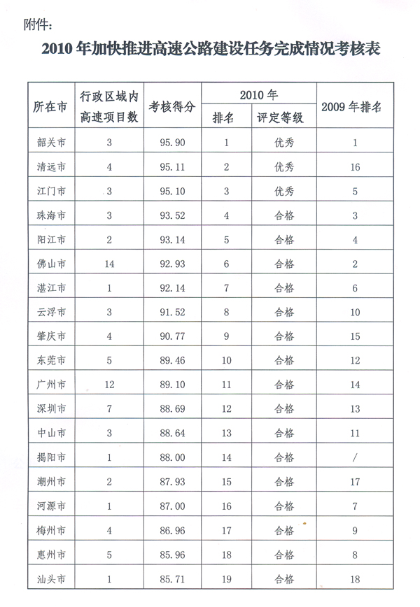 關(guān)于2010年我省高速公路建設(shè) 目標(biāo)任務(wù)完成情況的通報 ? 各地級以上市人民政府,各縣(市、區(qū))人民政府,省政府各部門、各直屬機構(gòu): 2010年,各地、各有關(guān)部門和各高速公路項目業(yè)主單位按照省委、省政府決策部署,搶抓機遇,加快以高速公路為“龍頭”的交通基礎(chǔ)設(shè)施建設(shè),高速公路通車?yán)锍倘〉昧藲v史性的突破,“十一五”規(guī)劃建設(shè)任務(wù)圓滿完成,為應(yīng)對國際金融危機沖擊,保持全省經(jīng)濟社會平穩(wěn)較快發(fā)展作出了積極貢獻。有關(guān)情況通報如下: 一、高速公路項目建設(shè)總體進展情況 ?。ㄒ唬┤旮咚俟方ㄔO(shè)目標(biāo)順利完成。2010年全省高速公路建設(shè)完成投資493億元,為年度計劃的103%,同比增長33.4%。加快推進續(xù)建高速公路項目33項(35段)共1974公里,新開工項目11項共535公里,順利建成了二廣高速公路懷集至三水段、韶贛高速公路、湛徐高速公路和陽陽高速公路等14個項目共800公里,南雄、仁化、始興、雷州、徐聞、廣寧、懷集和陽春等8縣(市)實現(xiàn)通高速公路目標(biāo),全省通高速公路縣(市)達54個,通達率80.6%。重點建設(shè)項目的關(guān)鍵環(huán)節(jié)任務(wù)基本按照《2010年度廣東省加快推進高速公路重點建設(shè)項目關(guān)鍵環(huán)節(jié)責(zé)任目標(biāo)分解》(以下稱《責(zé)任表》)的要求完成。全省高速公路通車?yán)锍掏黄?800公里。 (二)項目核準(zhǔn)和用地報批工作穩(wěn)步推進。各地、各有關(guān)部門認(rèn)真落實“綠色通道”和“并聯(lián)審批”制度,積極與國家相關(guān)部門匯報溝通,全力加快項目核準(zhǔn)、用地報批等工作,用地獲批數(shù)量創(chuàng)歷年之最。截至2010年底,羅陽高速公路、二廣高速公路連州至懷集段、江番高速公路及江珠高速公路北延線、潮惠高速公路等10個高速公路項目獲得核準(zhǔn);湛徐高速公路、增從高速公路、陽陽高速公路、江肇高速公路、廣樂高速公路韶關(guān)段等16項(19段)共1007公里整體用地獲得批復(fù)。 (三)征地拆遷工作取得較大進展。高速公路建設(shè)項目沿線各級政府切實承擔(dān)征地拆遷主體責(zé)任,按照《責(zé)任表》時限要求,加快推進征地拆遷工作,對嚴(yán)重制約高速公路建設(shè)的重點難點問題加強現(xiàn)場督辦,落實問責(zé)制度。韶關(guān)、清遠、江門、珠海、陽江、佛山、湛江等地各級政府及各參建單位上下聯(lián)動,力促2010年計劃建成通車項目的征地拆遷工作取得突破性進展,為項目如期完工創(chuàng)造了條件。 根據(jù)《廣東省加快重點交通基礎(chǔ)設(shè)施建設(shè)獎懲激勵辦法(試行)》規(guī)定,省有關(guān)部門對2010年全省高速公路建設(shè)目標(biāo)任務(wù)完成情況進行了考核,其中韶關(guān)、清遠和江門3市在落實高速公路重點項目建設(shè)各項目標(biāo)任務(wù)方面取得了突出成績,被評定為優(yōu)秀;珠海等16個地級以上市被評為合格(考核結(jié)果詳見附表,茂名、汕尾兩市行政區(qū)域內(nèi)2010年沒有高速公路建設(shè)項目,不參與該年度考核。)。韶關(guān)市連續(xù)兩年被評定為優(yōu)秀,予以通報表揚。 二、當(dāng)前影響加快推進高速公路建設(shè)的主要問題 ?。ㄒ唬┎糠致范握鞯夭疬w工作未按《責(zé)任表》限定時間完成。具體為:博深高速公路惠州段、東莞段和深圳段,廣珠西線高速公路三期中山段,廣河高速公路廣州段,廣州增從高速公路,汕揭高速公路汕頭段,梅大高速公路梅縣段。 (二)部分項目整體用地材料審批難。一是審批周期長,個別項目整體用地材料報至國土資源部已超過1年仍未得到批復(fù);二是受新增建設(shè)用地土地有償使用費繳納問題影響,部分項目整體用地材料已通過國務(wù)院審批,但因所在地政府尚未繳納新增建設(shè)用地土地有償使用費,將可能被國土資源部作退件處理,如佛開高速公路擴建工程江門段、太澳高速公路佛山順德至中山段(廣珠西線高速公路二期)、廣州繞城公路南段廣州段和佛山段等。 (三)部分項目跨越鐵路工程手續(xù)辦理難。受鐵路持續(xù)運營要求和運營安全等問題影響,目前我省在建高速公路涉及跨越鐵路工程審批手續(xù)辦理周期長、辦理難度大,制約了部分路段建設(shè),如肇花高速公路下穿武廣鐵路、廣樂高速公路上跨京廣鐵路等。 三、下一步工作要求 為實現(xiàn)本屆政府任期內(nèi)高速公路通車?yán)锍?500公里和“十二五”縣縣通高速公路目標(biāo),2011年全省高速公路要續(xù)建里程1732公里、計劃新開工里程超過700公里、力爭建成里程200公里,任務(wù)仍十分艱巨。各地、各有關(guān)部門要進一步統(tǒng)一思想,振奮精神,乘勢而上,狠抓重點項目建設(shè),確保做到領(lǐng)導(dǎo)到位、責(zé)任到位、落實到位,力促我省高速公路重點項目建設(shè)工作再上新臺階。省交通運輸廳要會有關(guān)部門抓緊制訂《2011年度廣東省加快推進高速公路重點建設(shè)項目關(guān)鍵環(huán)節(jié)責(zé)任目標(biāo)分解》報省政府同意后印發(fā)實施,并切實抓好督導(dǎo)落實;要商請廣州鐵路(集團)公司在2011年4月前審批肇花高速公路下穿武廣鐵路、廣樂高速公路上跨京廣鐵路等工程方案。省各有關(guān)部門要進一步落實完善“并聯(lián)審批”和“綠色