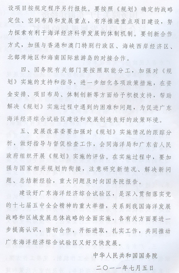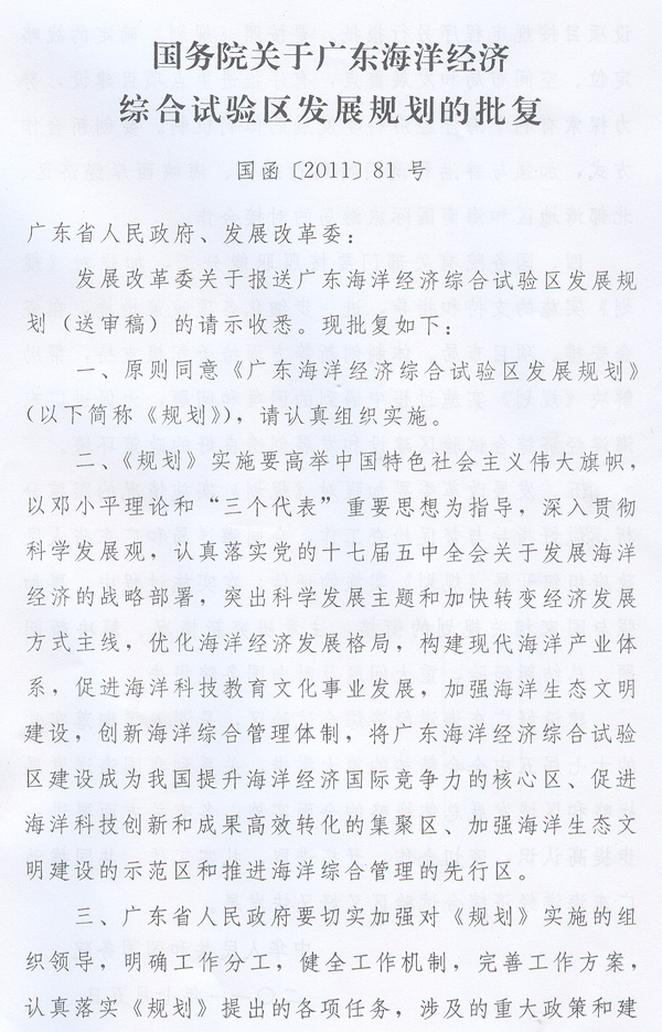 ? 轉(zhuǎn)發(fā)國務(wù)院關(guān)于廣東海洋經(jīng)濟(jì)綜合試驗(yàn)區(qū) 發(fā)展規(guī)劃的批復(fù)的通知 ? 各地級(jí)以上市人民政府,各縣(市、區(qū))人民政府,省政府各部門、各直屬機(jī)構(gòu): 現(xiàn)將《國務(wù)院關(guān)于廣東海洋經(jīng)濟(jì)綜合試驗(yàn)區(qū)發(fā)展規(guī)劃的批復(fù)》(國函〔2011〕81號(hào))轉(zhuǎn)發(fā)給你們,請遵照執(zhí)行。 《廣東海洋經(jīng)濟(jì)綜合試驗(yàn)區(qū)發(fā)展規(guī)劃》(以下簡稱《規(guī)劃》)是繼《珠江三角洲地區(qū)改革發(fā)展規(guī)劃綱要(2008-2020年)》之后,推動(dòng)我省經(jīng)濟(jì)社會(huì)發(fā)展的又一國家層面的規(guī)劃,為我省探索海洋開發(fā)新途徑和海洋綜合管理新模式,加快海洋經(jīng)濟(jì)發(fā)展,建設(shè)海洋經(jīng)濟(jì)強(qiáng)省,爭當(dāng)全國海洋事業(yè)發(fā)展排頭兵創(chuàng)造了新的重大機(jī)遇。各地、各有關(guān)部門要高度重視,把實(shí)施《規(guī)劃》作為“加快轉(zhuǎn)型升級(jí)、建設(shè)幸福廣東”的重要舉措,結(jié)合本地區(qū)、本部門實(shí)際,科學(xué)謀劃,精心部署,采取有效措施,推動(dòng)我省海洋經(jīng)濟(jì)加快發(fā)展。省發(fā)展改革委要會(huì)同省海洋漁業(yè)局加強(qiáng)對(duì)《規(guī)劃》實(shí)施工作的指導(dǎo)、監(jiān)督和檢查,抓緊制定實(shí)施《規(guī)劃》的政策措施,注重研究新情況、解決新問題,加快建立完善有利于加快我省海洋綜合開發(fā)的體制機(jī)制;要及時(shí)跟蹤分析實(shí)施情況,重大問題及時(shí)向省政府報(bào)告。 ? ? ? ? 廣東省人民政府 二○一一年七月二十九日 ? ? ? ? ?