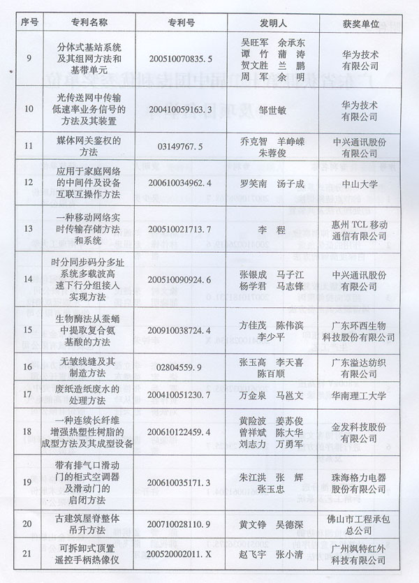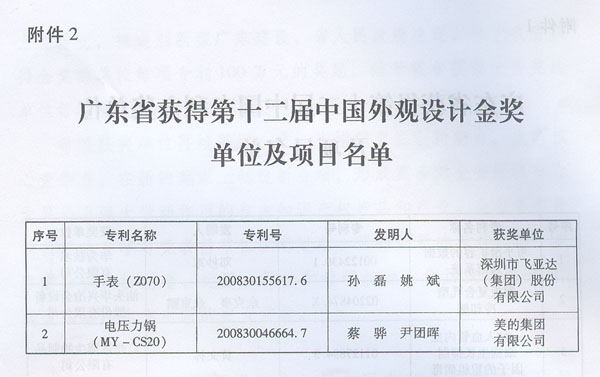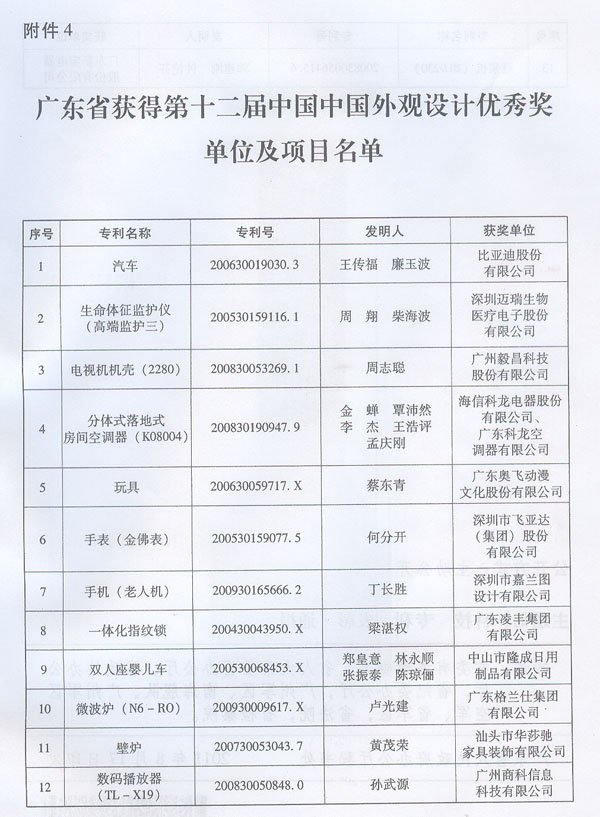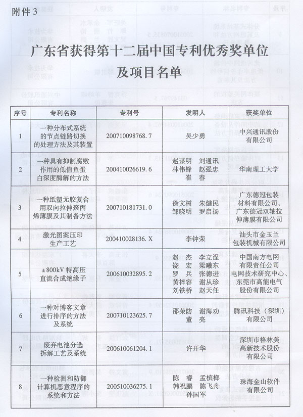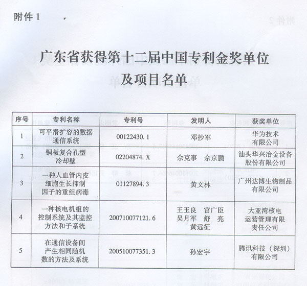 關(guān)于獎(jiǎng)勵(lì)我省獲得第十二屆 中國(guó)專利獎(jiǎng)單位的通報(bào) ? 各地級(jí)以上市人民政府,各縣(市、區(qū))人民政府,省政府各部門、各直屬機(jī)構(gòu): 在第十二屆中國(guó)專利獎(jiǎng)評(píng)選活動(dòng)中,我省華為技術(shù)有限公司“可平滑擴(kuò)容的數(shù)據(jù)通信系統(tǒng)”等5項(xiàng)發(fā)明和實(shí)用新型專利,深圳市飛亞達(dá)(集團(tuán))股份有限公司“手表(Z070)”等兩項(xiàng)外觀設(shè)計(jì)專利,被國(guó)家知識(shí)產(chǎn)權(quán)局和世界知識(shí)產(chǎn)權(quán)組織分別授予中國(guó)專利金獎(jiǎng)和中國(guó)外觀設(shè)計(jì)金獎(jiǎng);中興通訊股份有限公司“一種分布式系統(tǒng)的節(jié)點(diǎn)鏈路切換的處理方法及其裝置”等21項(xiàng)發(fā)明和實(shí)用新型專利,比亞迪股份有限公司“汽車”等13項(xiàng)外觀設(shè)計(jì)專利被國(guó)家知識(shí)產(chǎn)權(quán)局分別授予中國(guó)專利優(yōu)秀獎(jiǎng)和中國(guó)外觀設(shè)計(jì)優(yōu)秀獎(jiǎng)。為落實(shí)科學(xué)發(fā)展觀,鼓勵(lì)發(fā)明創(chuàng)造,加快經(jīng)濟(jì)發(fā)展方式轉(zhuǎn)變,推進(jìn)創(chuàng)新型廣東建設(shè),省人民政府決定,給予我省獲得金獎(jiǎng)的單位每項(xiàng)專利100萬(wàn)元的獎(jiǎng)勵(lì),給予我省獲得優(yōu)秀獎(jiǎng)的單位每項(xiàng)專利50萬(wàn)元的獎(jiǎng)勵(lì)。 希望獲獎(jiǎng)單位再接再厲,進(jìn)一步增強(qiáng)自主創(chuàng)新能力,提高核心競(jìng)爭(zhēng)力,在新的起點(diǎn)上創(chuàng)造新業(yè)績(jī),形成更多對(duì)全省經(jīng)濟(jì)社會(huì)發(fā)展具有強(qiáng)大帶動(dòng)作用的自主知識(shí)產(chǎn)權(quán)產(chǎn)品和產(chǎn)業(yè)。全省各有關(guān)單位要認(rèn)真學(xué)習(xí)受表?yè)P(yáng)單位銳意進(jìn)取、開(kāi)拓創(chuàng)新的精神,進(jìn)一步提高知識(shí)產(chǎn)權(quán)創(chuàng)造、運(yùn)用、保護(hù)和管理能力,為加快轉(zhuǎn)型升級(jí)、建設(shè)幸福廣東作出新的更大貢獻(xiàn)。 ? 附件:1.廣東省獲得第十二屆中國(guó)專利金獎(jiǎng)單位及項(xiàng)目名單 2.廣東省獲得第十二屆中國(guó)外觀設(shè)計(jì)金獎(jiǎng)單位及項(xiàng)目名單 3.廣東省獲得第十二屆中國(guó)專利優(yōu)秀獎(jiǎng)單位及項(xiàng)目名單 4.廣東省獲得第十二屆中國(guó)外觀設(shè)計(jì)優(yōu)秀獎(jiǎng)單位及項(xiàng)目名單 ? ? ? 廣東省人民政府 二○一一年八月十七日 ? ? ? ?