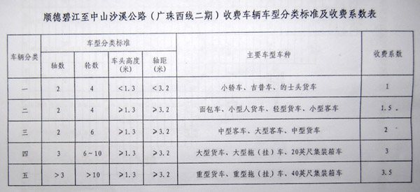 省交通運(yùn)輸廳、物價(jià)局: 粵交費(fèi)〔2010〕358號(hào)請(qǐng)示收悉。省人民政府同意順德碧江至中山沙溪公路(廣珠西線(xiàn)二期)交工驗(yàn)收通車(chē)和收費(fèi)站收費(fèi)設(shè)施經(jīng)驗(yàn)收符合省聯(lián)網(wǎng)收費(fèi)技術(shù)要求后開(kāi)始收費(fèi),收費(fèi)車(chē)型按全省高速公路統(tǒng)一標(biāo)準(zhǔn),即按車(chē)輛軸(輪)數(shù)及車(chē)頭高度等物理參數(shù)進(jìn)行分類(lèi),一至五類(lèi)車(chē)收費(fèi)系數(shù)分別是1、1.5、2、3、3.5;收費(fèi)標(biāo)準(zhǔn)為0.6元/標(biāo)準(zhǔn)車(chē)公里。 ? 附件:1.順德碧江至中山沙溪公路(廣珠西線(xiàn)二期)收費(fèi)車(chē)輛車(chē)型分類(lèi)標(biāo)準(zhǔn)及收費(fèi)系數(shù)表 2.順德碧江至中山沙溪公路(廣珠西線(xiàn)二期)車(chē)輛通行費(fèi)收費(fèi)標(biāo)準(zhǔn)表