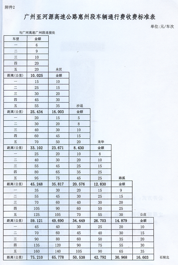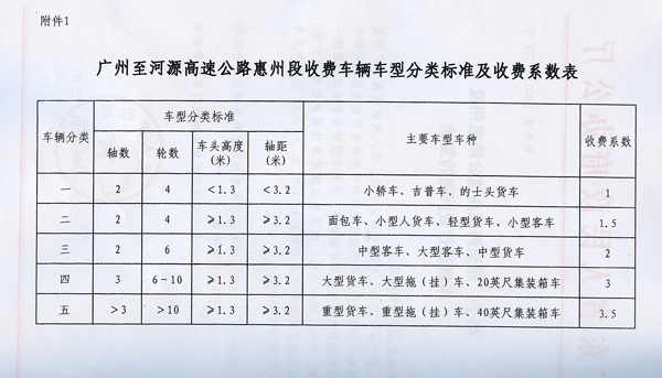 附件:1.廣州至河源高速公路惠州段收費(fèi)車(chē)輛車(chē)型分類標(biāo)準(zhǔn)及收費(fèi)系數(shù)表 2.廣州至河源高速公路惠州段車(chē)輛通行費(fèi)收費(fèi)標(biāo)準(zhǔn)表