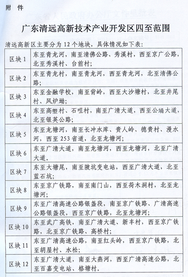 清遠市人民政府: 清府〔2011〕6號文收悉。經(jīng)省人民政府同意,現(xiàn)函復如下: 一、省人民政府同意認定廣東清遠經(jīng)濟技術(shù)開發(fā)區(qū)為省級高新技術(shù)產(chǎn)業(yè)開發(fā)區(qū),定名為廣東清遠高新技術(shù)產(chǎn)業(yè)開發(fā)區(qū),實行現(xiàn)行省級高新技術(shù)產(chǎn)業(yè)開發(fā)區(qū)政策。 二、廣東清遠高新技術(shù)產(chǎn)業(yè)開發(fā)區(qū)不增加規(guī)劃面積,仍為19.1274平方公里,區(qū)域范圍為國家有關(guān)部門公布的開發(fā)區(qū)審核公告確定的清遠經(jīng)濟技術(shù)開發(fā)區(qū)四至范圍內(nèi)(具體四至范圍見附件)。 三、廣東清遠高新技術(shù)產(chǎn)業(yè)開發(fā)區(qū)必須嚴格實施土地利用總體規(guī)劃和城市總體規(guī)劃,按規(guī)定履行具體土地報批手續(xù),依法供地,切實做到合理、集約、高效利用土地資源。 四、廣東清遠高新技術(shù)產(chǎn)業(yè)開發(fā)區(qū)要以科學發(fā)展觀為指導,努力集聚自主創(chuàng)新資源,提升產(chǎn)業(yè)競爭力和自主創(chuàng)新能力,發(fā)展高新技術(shù)產(chǎn)業(yè)和高附加值服務,充分發(fā)揮輻射和示范帶動作用。 五、你市要加強指導和服務,促進廣東清遠高新技術(shù)產(chǎn)業(yè)開發(fā)區(qū)健康發(fā)展。 ? 附件:廣東清遠高新技術(shù)產(chǎn)業(yè)開發(fā)區(qū)四至范圍 ? 廣東省人民政府辦公廳 二○一一年十二月三十一日