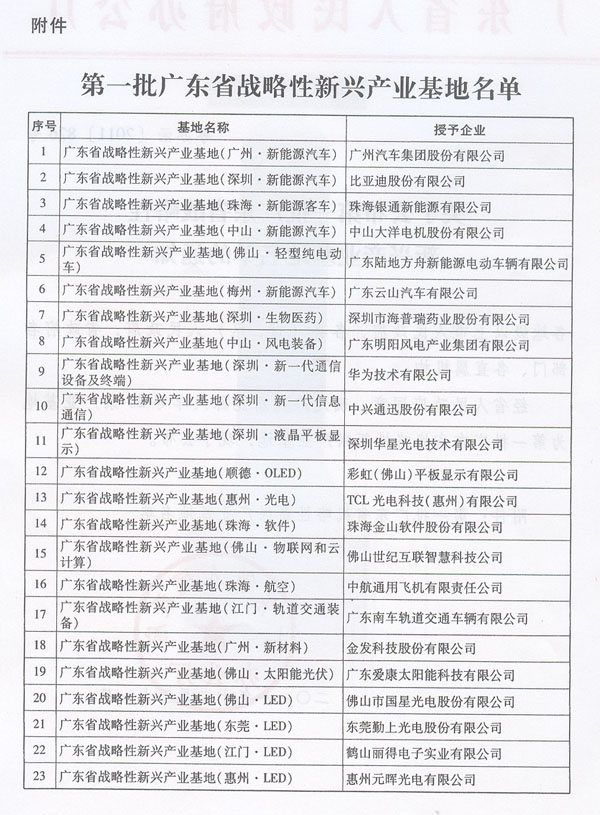 ? 關(guān)于公布第一批廣東省戰(zhàn)略性 新興產(chǎn)業(yè)基地名單的通知 ? 各地級(jí)以上市人民政府,各縣(市、區(qū))人民政府,省政府各部門、各直屬機(jī)構(gòu): 經(jīng)省人民政府同意,確定廣州新能源汽車等23家產(chǎn)業(yè)基地為第一批廣東省戰(zhàn)略性新興產(chǎn)業(yè)基地,現(xiàn)予公布。 ? 附件:第一批廣東省戰(zhàn)略性新興產(chǎn)業(yè)基地名單 ? ? ? ? 廣東省人民政府辦公廳 二○一一年十二月三十一日 ? ?