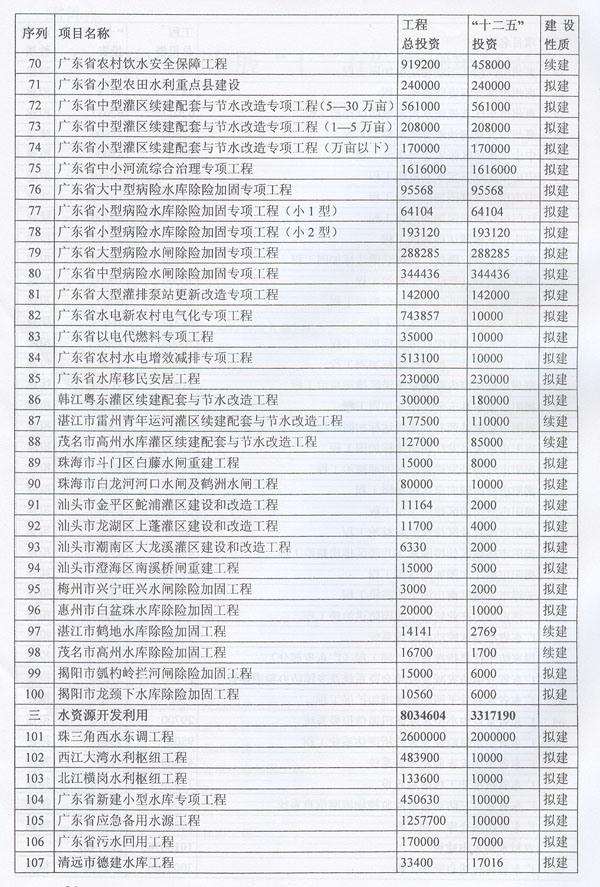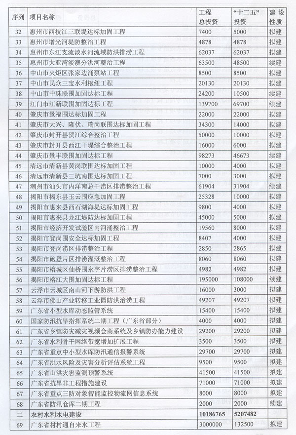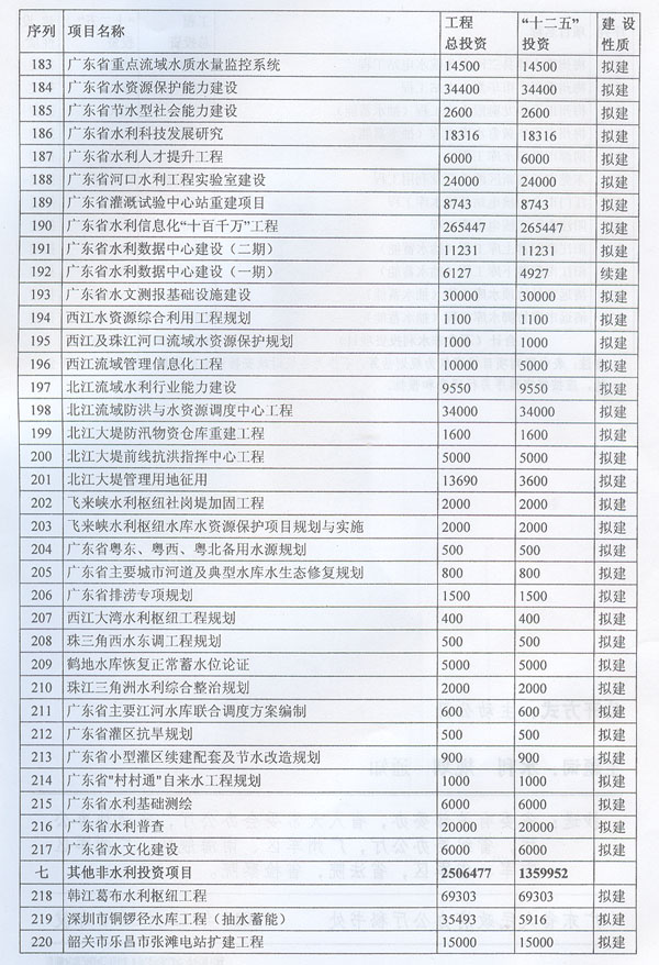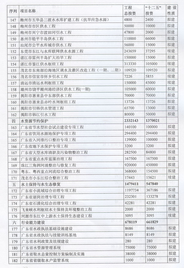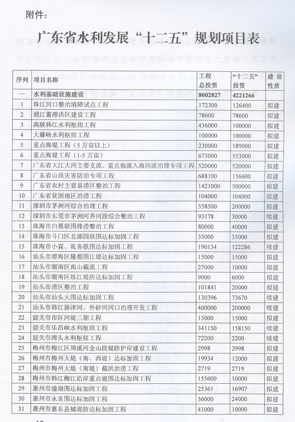 ? 印發(fā)廣東省水利發(fā)展“十二五”規(guī)劃的通知 ? 各地級以上市人民政府,各縣(市、區(qū))人民政府,省政府各部門、各直屬機(jī)構(gòu): 《廣東省水利發(fā)展“十二五”規(guī)劃》已經(jīng)省人民政府同意,現(xiàn)印發(fā)給你們,請認(rèn)真貫徹實施。實施中遇到的問題,請徑向省水利廳、發(fā)展改革委反映。 ? ? ? ? 廣東省人民政府辦公廳二○一一年十二月二十九日 ? ? ? 廣東省水利發(fā)展“十二五”規(guī)劃 ? ? ? ? 目 錄 ? 一、現(xiàn)狀與形勢 …………………………………………………………(1) ?。ㄒ唬笆晃濉睍r期廣東水利發(fā)展成效顯著…………………………(1) (二)“十二五”時期廣東水利發(fā)展形勢………………………………(2) 1.廣東水利跨越式發(fā)展面臨的挑戰(zhàn) ……………………………………(2) 2.廣東水利發(fā)展進(jìn)入重要戰(zhàn)略機(jī)遇期 …………………………………(3) 二、指導(dǎo)思想、基本原則和規(guī)劃目標(biāo)……………………………………(3) ?。ㄒ唬┲笇?dǎo)思想……………………………………………………………(3) ?。ǘ┗驹瓌t……………………………………………………………(4) ?。ㄈ┮?guī)劃目標(biāo)……………………………………………………………(5) 三、主要任務(wù)………………………………………………………………(6) ?。ㄒ唬┩晟妻r(nóng)村水利基礎(chǔ)設(shè)施……………………………………………(6) 1.突出加強(qiáng)農(nóng)田水利建設(shè) ………………………………………………(6) 2.繼續(xù)推進(jìn)農(nóng)村飲水安全工程 …………………………………………(6) 3.開展農(nóng)村重點易澇區(qū)整治 ……………………………………………(7) 4.加強(qiáng)農(nóng)村水電與電氣化建 ……………………………………………(7) 5.推進(jìn)水庫移民安居工程建設(shè) …………………………………………(7) ?。ǘ┘訌?qiáng)防洪體系建設(shè)…………………………………………………(7) 1.完善主要江河防洪體系 ………………………………………………(7) 2.加強(qiáng)中小河流治理 ……………………………………………………(8) 3.加快推進(jìn)“千里海堤加固達(dá)標(biāo)工程” ………………………………(8) 4.繼續(xù)實施病險水庫水閘除險加固工程 ………………………………(8) 5.強(qiáng)化山洪災(zāi)害防治 ……………………………………………………(9) 6.強(qiáng)化非工程措施建 ……………………………………………………(9) ?。ㄈ﹥?yōu)化水資源配………………………………………………………(9) 1.加快建設(shè)水利樞紐及河庫水系連通工程 ……………………………(9) 2.加快建設(shè)調(diào)引提蓄水工程 ……………………………………………(10) 3.加快推進(jìn)應(yīng)急備用水源及非常規(guī)水源建設(shè) …………………………(10) (四)加強(qiáng)水資源保護(hù)與節(jié)約……………………………………………(10) 1.加強(qiáng)重點飲用水水源地保護(hù) …………………………………………(10) 2.加強(qiáng)水庫水資源保護(hù) …………………………………………………(11) 3.加大地下水保護(hù)力度 …………………………………………………(11) 4.加強(qiáng)重點河道(涌)整治 ……………………………………………(11) 5.加強(qiáng)水土保持與生態(tài)修復(fù) ……………………………………………(11) 6.全面推進(jìn)節(jié)水型社會建設(shè) ……………………………………………(11) ?。ㄎ澹嵭凶顕?yán)格水資源管理制度………………………………………(12) 1.建立用水總量控制制度 ………………………………………………(12) 2.建立用水效率控制制度 ………………………………………………(12) 3.建立水功能區(qū)限制納污制度 …………………………………………(13) ?。┥罨w制機(jī)制改革……………………………………………(13) 1.深化水管體制改革 ……………………………………………………(13) 2.加強(qiáng)水利法制建設(shè) ……………………………………………………(13) 3.大力提升水利行業(yè)能力 ………………………………………………(13) 4.提高水利應(yīng)急管理能力 ………………………………………………(14) 5.強(qiáng)化水行政執(zhí)法能力 …………………………………………………(14) 6.推動水文化建設(shè) ………………………………………………………(15) 四、保障措施………………………………………………………………(15) ?。ㄒ唬┘訌?qiáng)組織領(lǐng)導(dǎo)………………………………………………………(15) (二)加大資金投入………………………………………………………(15) ?。ㄈ┛茖W(xué)制訂規(guī)劃………………………………………………………(15) (四)加強(qiáng)隊伍建設(shè)………………………………………………………(16) ?。ㄎ澹?qiáng)化監(jiān)督檢查………………………………………………………(16) ?。┲匾暛h(huán)境保護(hù)………………………………………………………(16) 附件:廣東省水利發(fā)展“十二五”規(guī)劃項目表…………………………(18) ? ? ? 加