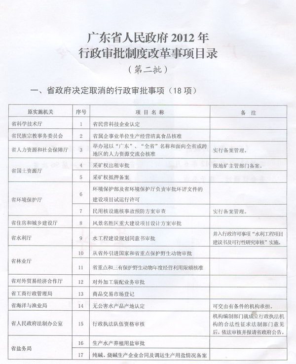 | 名稱: | 廣東省人民政府2012年行政審批制度改革事項(xiàng)目錄(第二批) | ||