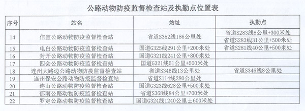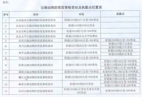 ? 廣東省人民政府辦公廳關(guān)于同意延長 從化溫泉等22個(gè)公路動(dòng)物防疫 監(jiān)督檢查站設(shè)站時(shí)間的復(fù)函 ? 廣州、韶關(guān)、河源、梅州、陽江、湛江、茂名、肇慶、清遠(yuǎn)、云浮市人民政府,省農(nóng)業(yè)廳: 穗府報(bào)〔2012〕129號、韶府請〔2012〕26號、河府〔2012〕54號、梅市府報(bào)〔2012〕45號、陽府〔2012〕47號、湛府〔2012〕50號、茂府〔2012〕52號、肇府報(bào)〔2012〕33號、清府〔2012〕51號、云府〔2012〕60號文收悉。省人民政府同意延長從化溫泉、從化良口、從化石嶺、從化太平、樂昌、龍川、和平、平遠(yuǎn)、陽春、徐聞、廉江、麻章、化州、信宜、電白、封開、四會(huì)、連州大路邊、連州保安、連山、郁南、羅定公路動(dòng)物防疫監(jiān)督檢查站的設(shè)站時(shí)間。上述各檢查站、執(zhí)勤點(diǎn)的設(shè)站(點(diǎn))期限均至2014年9月30日24時(shí)止。檢查站與執(zhí)勤點(diǎn)不得同時(shí)上崗執(zhí)法,執(zhí)法人員不得超越檢查站或執(zhí)勤點(diǎn)進(jìn)行流動(dòng)檢查。請切實(shí)做好監(jiān)督管理工作,確保依法檢查、文明執(zhí)法,嚴(yán)防公路“三亂”行為發(fā)生。 ? 附件:公路動(dòng)物防疫監(jiān)督檢查站及執(zhí)勤點(diǎn)位置表 ? ? ? ? 省府辦公廳 2012年9月26日 ? ?