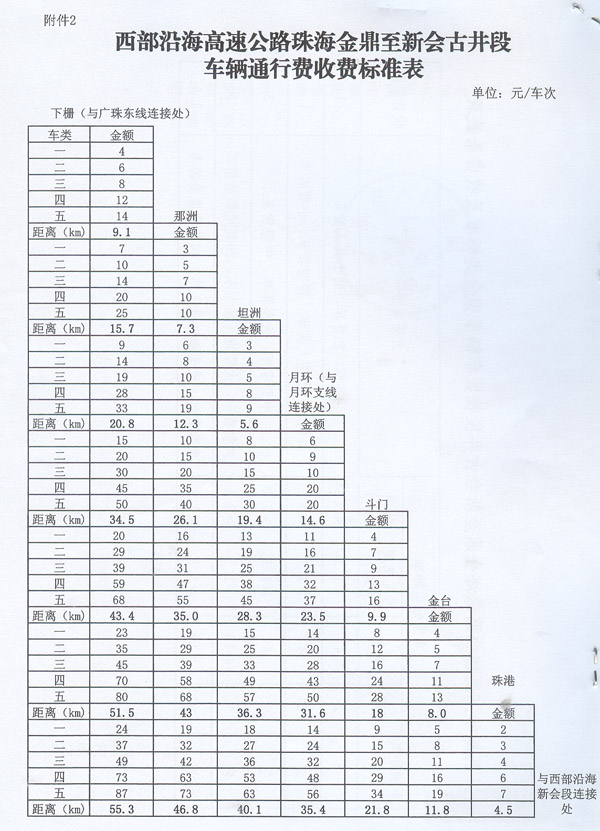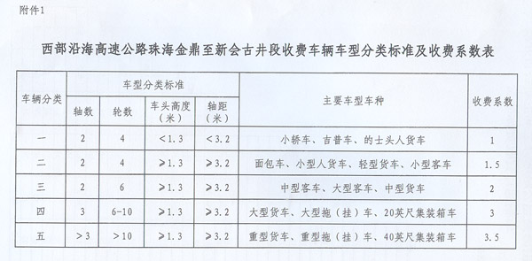 ? 廣東省人民政府辦公廳關(guān)于西部沿海高速公路 珠海金鼎至新會古井段金臺收費站車輛 通行費有關(guān)問題的復(fù)函 ? 省交通運輸廳、物價局: 粵交費〔2012〕1426號請示收悉。省人民政府同意西部沿海高速公路珠海金鼎至新會古井段金臺互通立交交工驗收通車和金臺收費站收費設(shè)施經(jīng)驗收符合省聯(lián)網(wǎng)收費技術(shù)要求后開始收費,收費車型按全省高速公路統(tǒng)一標(biāo)準(zhǔn),即按車輛軸(輪)數(shù)及車頭高度等物理參數(shù)進行分類,一至五類車的收費系數(shù)分別為1、1.5、2、3、3.5;收費標(biāo)準(zhǔn)按雙向4車道0.45元/標(biāo)準(zhǔn)車公里執(zhí)行。 ? 附件:1.西部沿海高速公路珠海金鼎至新會古井段收費車輛車型分類標(biāo)準(zhǔn)及收費系數(shù)表 2.西部沿海高速公路珠海金鼎至新會古井段車輛通行費收費標(biāo)準(zhǔn)表 ? ? ? ? 省府辦公廳 2012年12月20日 ? ? ? ?
