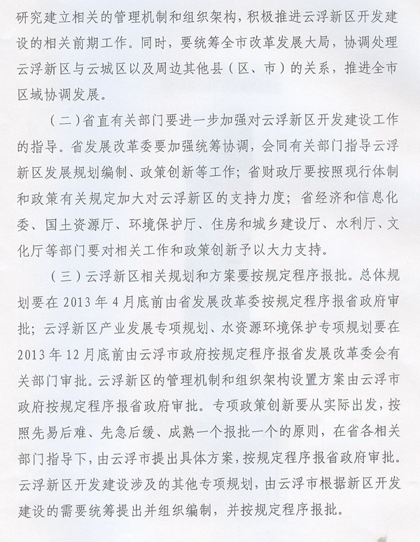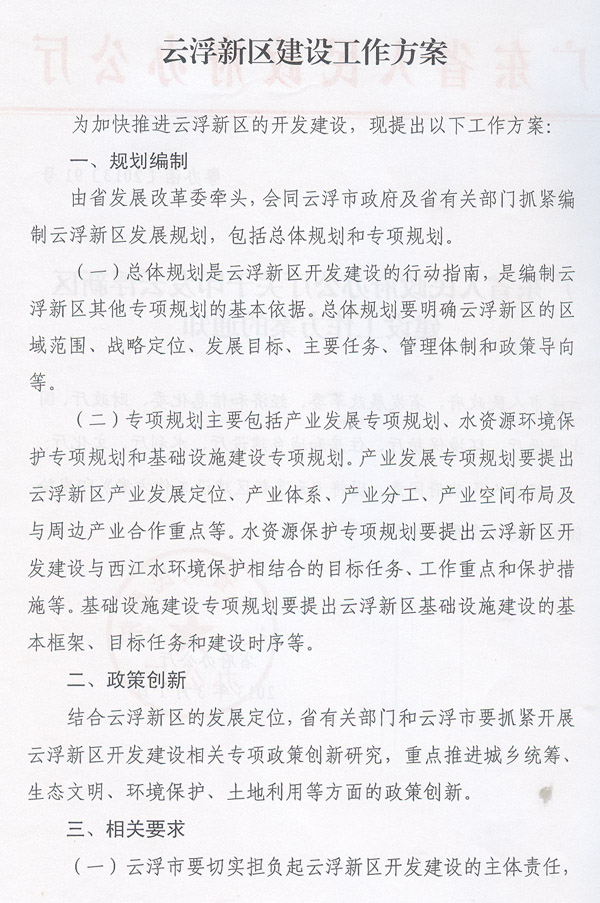 廣東省人民政府辦公廳關于印發(fā)云浮新區(qū) 建設工作方案的通知? 經(jīng)省人民政府同意,現(xiàn)將《云浮新區(qū)建設工作方案》印發(fā)給你們,請認真貫徹執(zhí)行。? ? ? ? 省府辦公廳 2013年3月1日