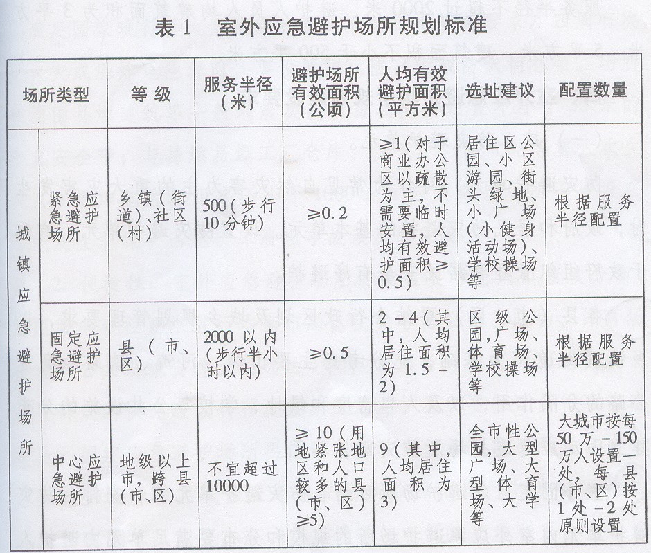 2.室內(nèi)應急避護場所規(guī)劃標準。 服務半徑不超過2000米,避護人員人均建筑面積為3平方米-5平方米,建筑面積不小于500平方米。 四、室外應急避護場所規(guī)劃建設要求 (一)建立防災避護單元。 防災避護單元,可作為常見自然災害為主的重大災害發(fā)生時,政府和居民防災避護的基本單元。設置防災避護單元,有利于政府組織管理和居民安全有序避護。 各縣(市、區(qū))要結合行政區(qū)劃及城鄉(xiāng)規(guī)劃管理要求,以鄉(xiāng)鎮(zhèn)(街道)為基礎,充分考慮主要山體、河流、鐵路、高速公路的分隔作用,以及人口密度和綠地、學校等公共設施的分布建立固定應急避護場所防災避護單元。 室外固定應急避護場所可結合防災避護單元統(tǒng)一安排,防災避護單元內(nèi)室外應急避護場所的規(guī)模和分布要滿足單元內(nèi)避護人員的避護需求。未納入防災避護單元的部分偏遠、零散居民點可由鄰近單元提供應急避護。 (二)選址要求。 室外應急避護場所的建設選址需要符合以下要求: 1.安全性。選址要避開地震斷裂帶和可能發(fā)生地質(zhì)災害的地區(qū),遠離水庫泄洪區(qū)、低洼地易積水地區(qū),以及高壓走廊、次高壓以上燃氣管道、成品油輸送管道、大型油氣及其他危險倉儲區(qū)、大型化工園區(qū)等危險設施的影響范圍,高層建筑物、高聳構筑物的垮塌范圍。室外應急避護場所距次生災害危險源的距離,要滿足國家現(xiàn)行重大危險源和防火有關標準規(guī)范要求。四周有次生火災或爆炸危險源時,要設置防火隔離帶或防火樹林帶。場所與周圍易燃建筑等一般地震次生災源之間要設置不小于30米的防火安全帶;與易燃易爆工廠倉庫、供氣廠、儲氣站等重大次生火災或爆炸危險源距離不小于1000米。應急避護場所不得設在可能發(fā)生非煤礦山尾礦庫潰壩事故波及的范圍內(nèi)。 2.便捷性。室外應急避護場所的設置要考慮人口密度分布、按照服務半徑要求進行均衡布局,優(yōu)先考慮公園、廣場、體育場等現(xiàn)有公共設施資源。要選址于周邊道路條件較好的用地,便于受災群眾的快速疏散轉(zhuǎn)移。緊急應急避護場所要保證步行可快速到達;固定應急避護場所要保證車行和步行均可便捷到達;中心應急避護場所和區(qū)域性應急避護場所除保證車行和步行可達性外,要確保與城市陸、海、空交通系統(tǒng)有便捷交通聯(lián)系。 3.合法性。縣級以上文物保護單位的公園等場所作為應急避護場所時,要劃定避護區(qū)域,有關避護設施建設不得破壞文物及其環(huán)境。相關設施要盡量在文物保護單位的建設控制地帶之外。如因條件所限制需要設于建筑控制地帶之內(nèi)的,要依照文物保護的相關法律法規(guī)按程序報批。 (三)規(guī)劃要求。 1.緊急應急避護場所規(guī)劃要求。 ?。?)緊急應急避護場所要按照場所服務范圍內(nèi)的晝夜最大人口峰值進行設置。 (2)緊急應急避護場所以城鄉(xiāng)開敞空間為主,可利用城鄉(xiāng)中小學校操場、露天體育場所、社區(qū)(村)公園,露天停車場、小廣場、街頭綠地、農(nóng)村曬谷場,以及地勢較高、地質(zhì)條件穩(wěn)定的空地等。 ?。?)城中村地區(qū)和高密度的商業(yè)、辦公區(qū),要通過“三舊”(舊城鎮(zhèn)、舊村莊、舊廠房)改造和城市更新增加綠地廣場、停車場等設置緊急應急避護場所。 2.固定應急避護場所規(guī)劃要求。 (1)以防災避護單元為單位,應急避護場所容納人數(shù)原則上按照規(guī)劃城鎮(zhèn)常住人口的20%-30%進行配置。城市中心城區(qū)要按照不低于規(guī)劃城鎮(zhèn)常住人口的30%進行配置。到2020年,全省固定應急避護場所不少于3805處,容納人數(shù)不少于2276萬人,有效面積不少于6828公頃。各地級以上市、順德區(qū)固定應急避護場所規(guī)劃建設規(guī)模詳見表2。 表2全省各地級以上市、順德區(qū)室外固定 應急避護場所規(guī)劃建設規(guī)模一覽表 ?