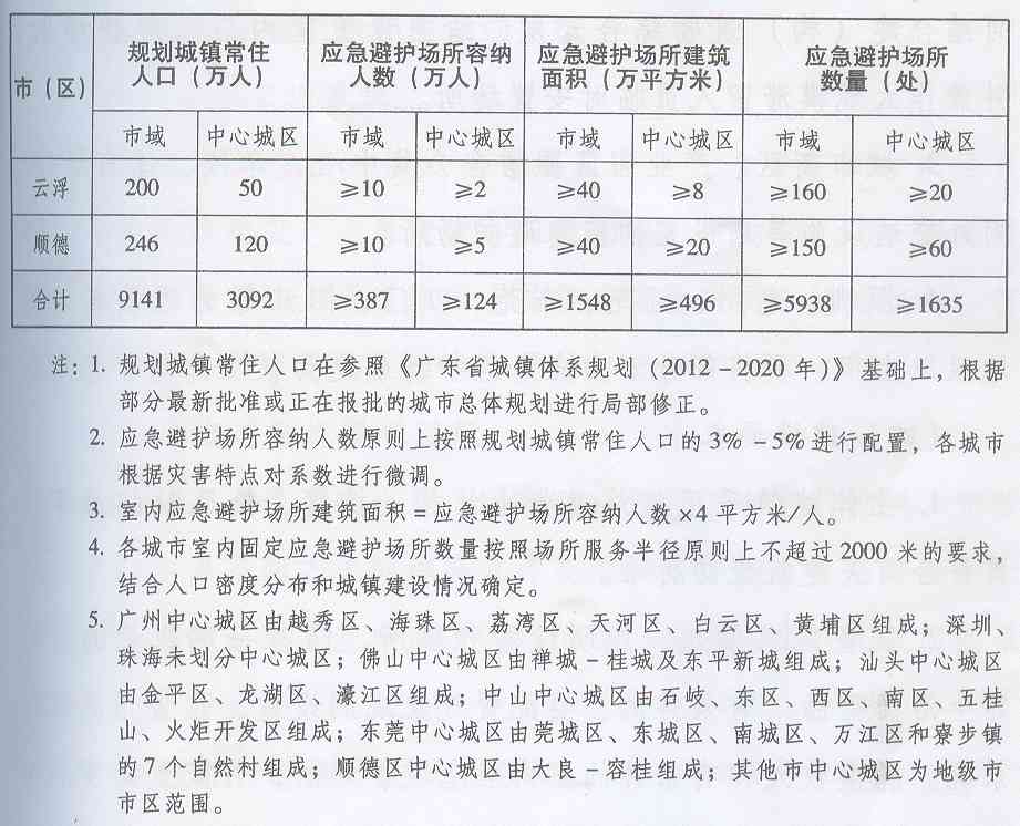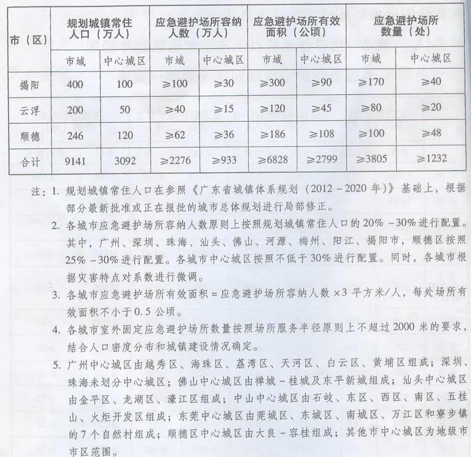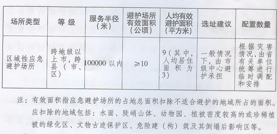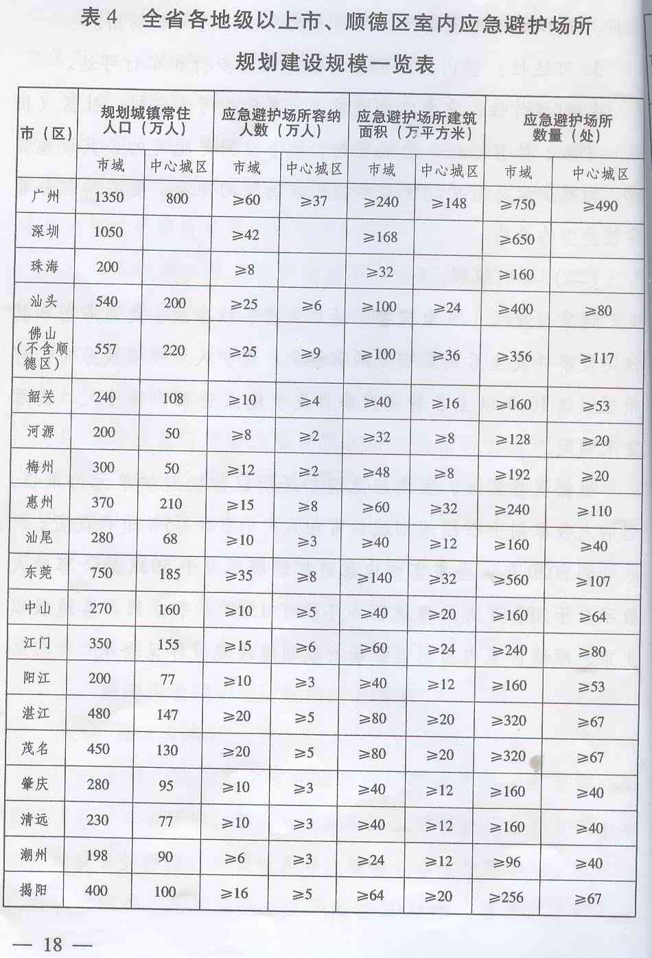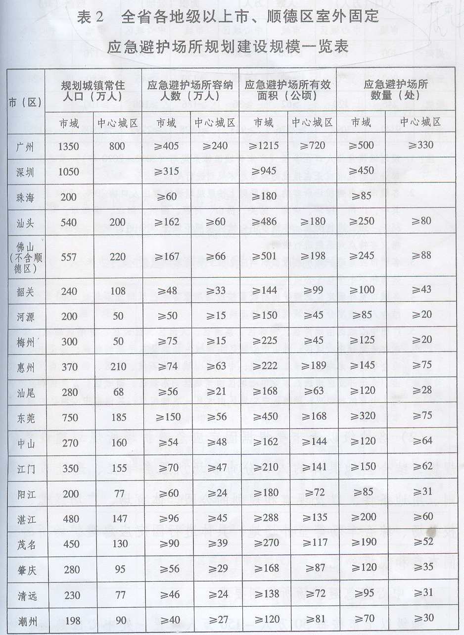 (四)建設要求。 1.科學選址。應急避護場所要避開可能發(fā)生各類地質(zhì)災害以及次生災害的地區(qū);遠離水庫泄洪區(qū)、洪水泛濫區(qū)、低洼地易積水地區(qū);周邊建筑要滿足抗震、防風等防災要求,并預留防護距離。所有應急避護場所建設要進行嚴格的場所安全性評價,尤其要根據(jù)其應對災種進行針對性的安全評價,并根據(jù)評價結果采取必要的防護措施或選擇其他替代場所。 2.分區(qū)合理。工程處理后地形坡度不宜大于7度,植被要以疏林、草地為主,易于搭建帳篷及臨時建筑,適宜根據(jù)承擔功能劃定棚宿區(qū)、應急指揮區(qū)、救援隊伍駐扎區(qū)、應急醫(yī)療區(qū)、物資儲備區(qū)等功能分區(qū)。 3.配套齊全。應急避護場所要配置指揮管理、應急供水、供電、廁所、消防、排污、垃圾儲運、醫(yī)療救護及防疫、物資儲備、洗浴、信息發(fā)布等設施,必要時,要增設氣象觀測設施。中心應急避護場所除配置固定應急避護場所必需設施外,要設置應急停車場、停機坪、救援部隊駐扎營地等。 4.交通暢通。室外應急避護場所人員出入口與車輛出入口要分開設置,最少要有方向不同的兩條或以上與外界相通的疏散通道。其中,固定應急避護場所至少要有兩個入口和兩個出口,場所內(nèi)部主要通道寬度不低于35米。 5.以人為本。應急避護場所要考慮殘疾人、老年人、傷病員等弱勢群體需要,完善通訊、廣播、醫(yī)療救護功能,進行無障礙設計,如坡道化設計、安排無障礙廁位等。 (五)標識系統(tǒng)。 1.室外應急避護場所要設置場所內(nèi)部指示標志和場所周邊指示標志。標志樣式、顏色等內(nèi)容詳見附件2。場所周邊指示標志要標明場所名稱和類型。 2.室外應急避護場所出入口等位置,要標明應急避護場所適用的災害類型及所承擔的主要功能。室外固定應急避護場所要繪制責任區(qū)域分布圖和內(nèi)部功能分區(qū)圖。 五、室內(nèi)應急避護場所規(guī)劃建設要求 (一)選址要求。 1.安全性:室內(nèi)應急避護場所選址要避開地震斷裂帶、地質(zhì)災害區(qū)、內(nèi)澇區(qū)域,遠離各類危險源;建筑抗風等級要高于本地風荷載設計標準;建筑抗震等級要高于本地抗震標準。 2.均衡性:按照服務半徑不超過2000米的要求,結合人口密度分布和城鎮(zhèn)建設情況,均衡布局室內(nèi)應急避護場所。 3.可達性:室內(nèi)應急避護場所要保證步行和車行可達。 4.可操作性:室內(nèi)應急避護場所要優(yōu)先考慮學校、社區(qū)(街鎮(zhèn))中心、體育場館、會展場館、地下空間等現(xiàn)有的公共設施資源。為減少應急避護功能與學校正常功能的沖突,要安排部分非學校類型的設施。 (二)場所規(guī)模。 通常情況下,氣象災害、地質(zhì)災害、核事故、交通滯留和其他突發(fā)事件發(fā)生后的影響是局部性的。避護人員規(guī)模及分布,可根據(jù)城鎮(zhèn)10年以上各種突發(fā)事件發(fā)生地點分布和轉(zhuǎn)移人口的總量來確定。 根據(jù)我省實際,室內(nèi)應急避護場所以防災避護單元為單位,容納人數(shù)原則上按照規(guī)劃城鎮(zhèn)常住人口的3%-5%進行配置。 到2020年,全省室內(nèi)應急避護場所不少于5938處,容納人數(shù)不少于387萬人,建筑面積不少于1548萬平方米。各地級以上市、順德區(qū)室內(nèi)應急避護場所規(guī)劃建設規(guī)模詳見表4。 表4全省各地級以上市、順德區(qū)室內(nèi)應急避護場所規(guī)劃建設規(guī)模一覽表 ?