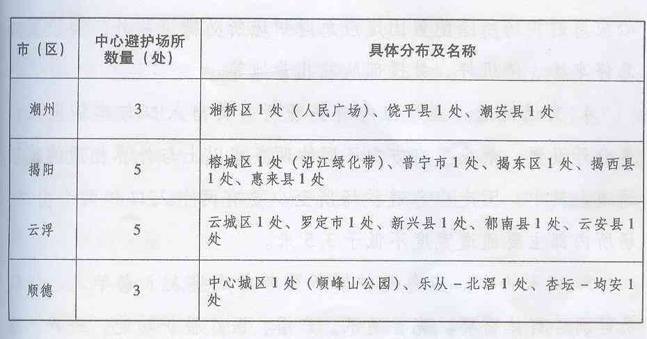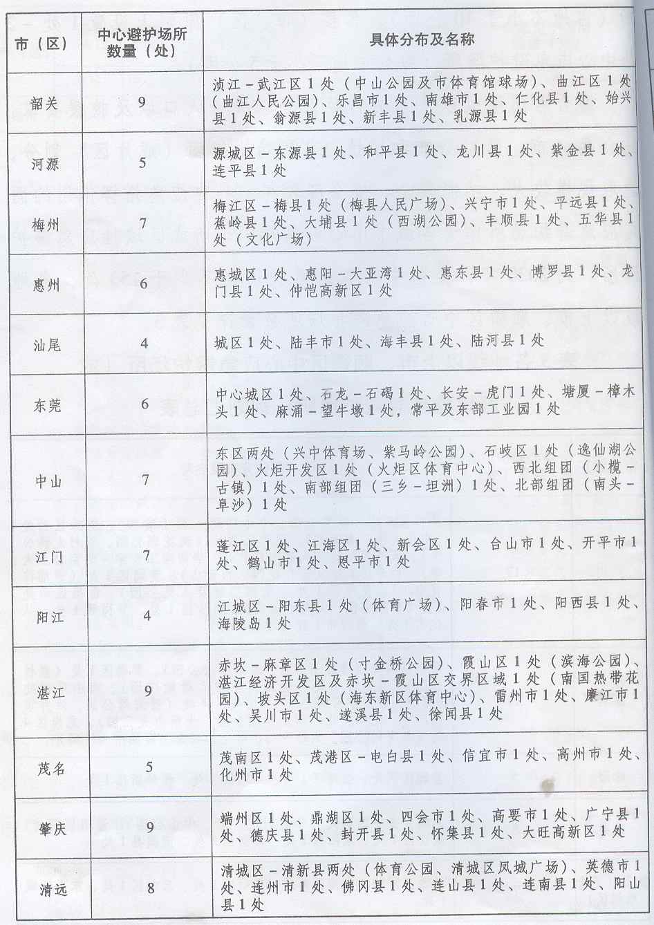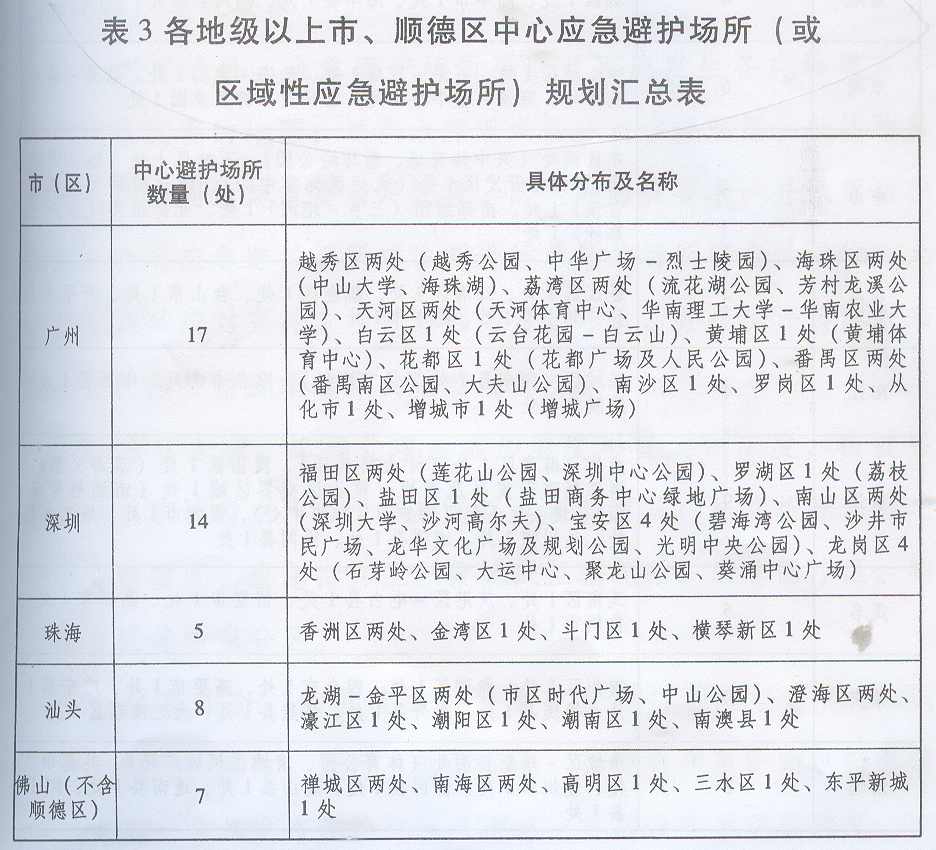 ?。?)各地級以上市要根據(jù)固定應急避護場所規(guī)劃建設總體規(guī)模,結合當?shù)鼐唧w的人口分布和場所服務半徑、選址布局原則、用地條件,以及現(xiàn)有和規(guī)劃的公園、體育場、廣場綠地、學校操場、綜合車場等室外場地,具體進行固定應急避護場所的空間布點和規(guī)模分配。 3.中心應急避護場所規(guī)劃要求。 地級以上市按每50萬人-150萬人設置一處中心應急避護場所(占地不小于10公頃),各縣(市、區(qū))原則上設置1處-2處中心應急避護場所(每處占地不小于5公頃)。 綜合考慮地級以上市的行政區(qū)劃、服務人口以及救援要求,結合縣(市、區(qū))分布和城鎮(zhèn)內(nèi)部的功能組團(或片區(qū))劃分,選取規(guī)模較大、功能較全、安全度較高,具有應急指揮作用的固定應急避護場所作為各城市中心應急避護場所或區(qū)域性應急避護場所。到2020年,全省中心應急避護場所不少于153處,各地級以上市、順德區(qū)中心應急避護場所數(shù)量詳見表3。 表3各地級以上市、順德區(qū)中心應急避護場所(或 區(qū)域性應急避護場所)規(guī)劃匯總表 ?