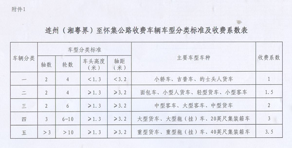粵交費(fèi)〔2013〕1300號(hào)請(qǐng)示收悉。省人民政府同意連州(湘粵界)至懷集公路(即二廣高速公路懷集至連州段)交工驗(yàn)收通車(chē)和收費(fèi)站收費(fèi)設(shè)施經(jīng)驗(yàn)收符合省聯(lián)網(wǎng)收費(fèi)技術(shù)要求后開(kāi)始收費(fèi),收費(fèi)車(chē)型按全省高速公路統(tǒng)一標(biāo)準(zhǔn),即按車(chē)輛軸(輪)數(shù)及車(chē)頭高度等物理參數(shù)進(jìn)行分類(lèi),一至五類(lèi)車(chē)的收費(fèi)系數(shù)分別為1、1.5、2、3、3.5;粵湘省界至鶴塘段及連州連接線收費(fèi)標(biāo)準(zhǔn)為0.45元/標(biāo)準(zhǔn)車(chē)公里,鶴塘至懷集南段及懷集支線收費(fèi)標(biāo)準(zhǔn)為0.6元/標(biāo)準(zhǔn)車(chē)公里。
