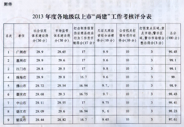 2013年以來(lái),全省各地認(rèn)真貫徹落實(shí)省委、省政府關(guān)于社會(huì)信用體系建設(shè)和市場(chǎng)監(jiān)管體系建設(shè)(以下簡(jiǎn)稱“兩建”)工作的各項(xiàng)部署,加強(qiáng)組織領(lǐng)導(dǎo),明確分工責(zé)任,分解工作任務(wù),有計(jì)劃、有目標(biāo)、有步驟地組織開(kāi)展“兩建”工作,為我省經(jīng)濟(jì)平穩(wěn)健康發(fā)展、社會(huì)和諧穩(wěn)定作出了積極貢獻(xiàn)。根據(jù)《中共廣東省委辦公廳廣東省人民政府辦公廳關(guān)于撤并和規(guī)范省級(jí)考核檢查評(píng)比表彰活動(dòng)的意見(jiàn)》(粵辦發(fā)〔2013〕11號(hào)),2014年1月,省“兩建”工作領(lǐng)導(dǎo)小組辦公室對(duì)各地級(jí)以上市“兩建”工作進(jìn)行了考核。經(jīng)綜合評(píng)定,21個(gè)地級(jí)以上市“兩建”工作考核全部合格,其中,廣州、惠州、江門、珠海市成績(jī)比較顯著。經(jīng)省人民政府同意,現(xiàn)將各地“兩建”工作情況通報(bào)如下: 一、精心部署落實(shí) 省“兩建”工作會(huì)議召開(kāi)后,各地級(jí)以上市政府高度重視,及時(shí)召開(kāi)相關(guān)工作會(huì)議,認(rèn)真貫徹落實(shí)省委、省政府關(guān)于“兩建”工作的政策部署,并以多種形式出臺(tái)有關(guān)文件,狠抓各項(xiàng)工作任務(wù)落實(shí)。在市場(chǎng)監(jiān)管體系建設(shè)方面,廣州、深圳等市結(jié)合實(shí)際制定了本市的市場(chǎng)監(jiān)管體系建設(shè)規(guī)劃,惠州、陽(yáng)江等市制定了貫徹落實(shí)省市場(chǎng)監(jiān)管體系建設(shè)規(guī)劃的實(shí)施意見(jiàn);在社會(huì)信用體系建設(shè)方面,廣州、珠海、中山等市制訂了《社會(huì)信用體系建設(shè)規(guī)劃(2013—2020年)》,廣州市還出臺(tái)了《廣州市信息共享管理規(guī)定》、《廣州市社會(huì)信用促進(jìn)條例》等多項(xiàng)規(guī)章制度。 一是市場(chǎng)準(zhǔn)入體系建設(shè)取得較大突破。率先在全國(guó)開(kāi)展商事登記制度改革試點(diǎn),按照“寬進(jìn)嚴(yán)管”的原則,推進(jìn)工商登記制度改革,清理、壓減前置審批事項(xiàng),放寬登記準(zhǔn)入條件,實(shí)行先證后照,強(qiáng)化事中、事后監(jiān)管。2013年3月1日,深圳、珠海正式實(shí)施具有地方性法規(guī)效力的商事登記制度。據(jù)統(tǒng)計(jì),深圳、珠海、東莞、順德等商事登記制度改革試點(diǎn)地區(qū),新登記市場(chǎng)主體增幅分別達(dá)到96.3%、41.5%、17.0%和16.4%,同期非試點(diǎn)地區(qū)市場(chǎng)主體增幅僅為0.5%。二是行政執(zhí)法體系建設(shè)取得良好效果。進(jìn)一步深化行政審批制度改革,大力簡(jiǎn)政放權(quán),共調(diào)整市級(jí)行政審批事項(xiàng)6165項(xiàng)、縣級(jí)14934項(xiàng)。積極探索建立綜合行政執(zhí)法體制,推動(dòng)執(zhí)法重心下移。佛山市順德區(qū)按土地、醫(yī)藥、市場(chǎng)、城市管理四大領(lǐng)域,整合行政執(zhí)法職責(zé)和隊(duì)伍,規(guī)范行政執(zhí)法行為,規(guī)范行政處罰自由裁量權(quán);珠海市制定《珠海市行政機(jī)關(guān)執(zhí)法依據(jù)匯編》、《珠海市規(guī)范行政處罰自由裁量權(quán)工作方案》。三是消費(fèi)維權(quán)和社會(huì)監(jiān)督體系建設(shè)取得重大進(jìn)展。以“12345”熱線為載體整合各部門投訴舉報(bào)資源,建設(shè)便民、高效的消費(fèi)維權(quán)申訴、經(jīng)濟(jì)違法行為舉報(bào)和行政效能投訴平臺(tái),實(shí)現(xiàn)統(tǒng)一接聽(tīng)、按責(zé)轉(zhuǎn)辦、限時(shí)辦結(jié)、統(tǒng)一督辦、統(tǒng)一考核。除東莞、揭陽(yáng)市外,目前全省已有19個(gè)地級(jí)以上市實(shí)現(xiàn)“12345”統(tǒng)一投訴舉報(bào)平臺(tái)上線運(yùn)行。四是政務(wù)誠(chéng)信建設(shè)深入推進(jìn)。積極推進(jìn)招標(biāo)投標(biāo)和政府采購(gòu)領(lǐng)域政務(wù)誠(chéng)信建設(shè),全部實(shí)現(xiàn)各市縣網(wǎng)上辦事分廳與省網(wǎng)上辦事大廳對(duì)接,實(shí)現(xiàn)省、市、縣(區(qū))三級(jí)數(shù)據(jù)同步,進(jìn)一步提高行政審批效率。珠海市圍繞電子政務(wù)、科學(xué)民主決策等方面開(kāi)展政務(wù)誠(chéng)信建設(shè),在網(wǎng)上辦事大廳珠海分廳增加公共資源網(wǎng)上交易、市民個(gè)人網(wǎng)頁(yè)等內(nèi)容。五是加快推進(jìn)質(zhì)量監(jiān)管體系建設(shè)。強(qiáng)化“不合格產(chǎn)品發(fā)現(xiàn)率”理念,著力完善產(chǎn)(商)品監(jiān)督抽查制度,大力實(shí)施標(biāo)準(zhǔn)化戰(zhàn)略,提升電子商務(wù)質(zhì)量,逐步建立現(xiàn)代質(zhì)量監(jiān)管體系。廣州、惠州等市大力完善公共與民生服務(wù)領(lǐng)域標(biāo)準(zhǔn)體系,深圳、佛山等市改革流通領(lǐng)域商品監(jiān)管方式,中山、茂名等市加強(qiáng)產(chǎn)品質(zhì)量監(jiān)督抽查,梅州、肇慶等市大力推動(dòng)旅游電子合同。六是進(jìn)一步理順食品安全監(jiān)管體制機(jī)制。以食品安全監(jiān)管體制改革為契機(jī),進(jìn)一步理順食品安全監(jiān)管職責(zé),出臺(tái)市縣兩級(jí)食品安全監(jiān)管體制改革文件,做好機(jī)構(gòu)編制、職能調(diào)整和人員劃分等工作。 一是信用激勵(lì)和懲戒機(jī)制建設(shè)取得明顯成效。惠