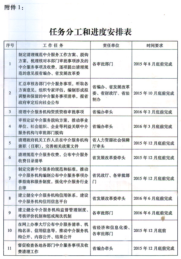 各有關(guān)部門要充分認識清理規(guī)范中介服務(wù)工作的重要性和緊迫性,切實加強組織領(lǐng)導,將清理規(guī)范工作與行政審批制度改革、分類推進事業(yè)單位改革、推進行業(yè)協(xié)會商會與行政機關(guān)脫鉤、建設(shè)社會信用體系等工作結(jié)合起來,制定本部門、本系統(tǒng)清理規(guī)范的具體工作方案,認真抓好落實,并建立健全申請人對中介服務(wù)評價反饋機制,向社會公布舉報投訴電話、電子郵箱等,主動接受社會監(jiān)督。各有關(guān)部門對照本單位實施的行政審批事項,梳理填報《中介服務(wù)事項及收費項目清理表》(見附件2),于2015年8月20日前報送省編辦、發(fā)展改革委。事業(yè)單位、社會組織、企業(yè)等利益關(guān)聯(lián)中介服務(wù)機構(gòu)與審批部門脫鉤方案于12月31日前報送省編辦。省編辦要會同省發(fā)展改革委、財政廳、民政廳、法制辦等部門,及時跟蹤各審批部門工作進展情況,加強統(tǒng)籌協(xié)調(diào)和督促檢查,確保清理規(guī)范中介服務(wù)工作取得實效。