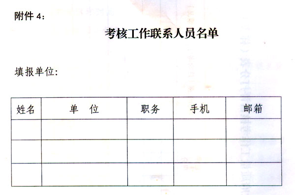 ?。ㄋ模┞?lián)系人員。為便于考核期間的溝通協(xié)調(diào),各地負(fù)責(zé)質(zhì)量工作考核的牽頭單位要指定1名分管領(lǐng)導(dǎo)和1名工作人員作為聯(lián)系人,并按要求填寫(xiě)附件4。