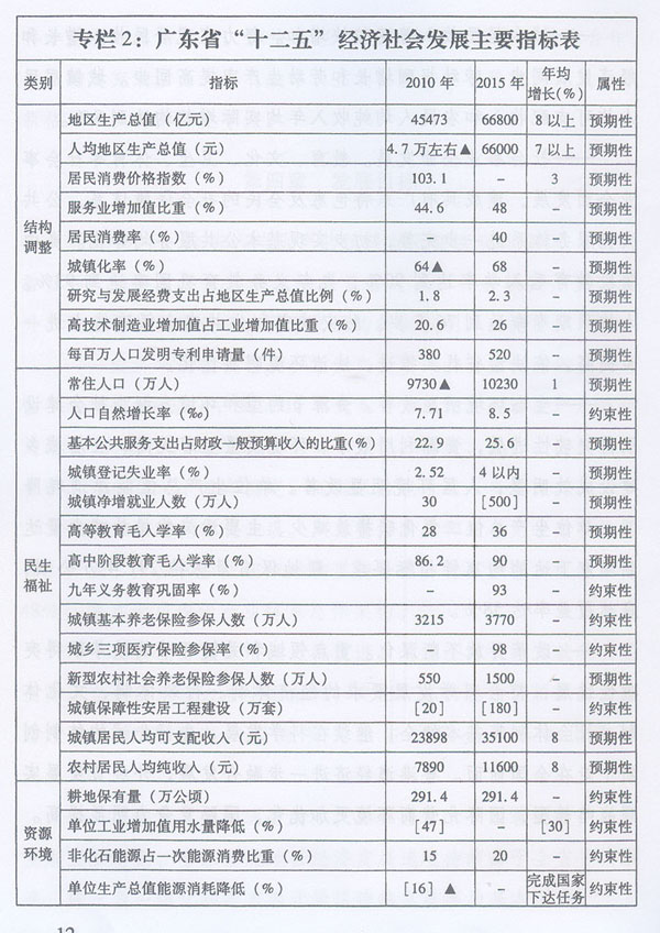 印發(fā)廣東省國民經(jīng)濟和社會發(fā)展 第十二個五年規(guī)劃綱要的通知 ? 各地級以上市人民政府,各縣(市、區(qū))人民政府,省政府各部門、各直屬機構(gòu): 《廣東省國民經(jīng)濟和社會發(fā)展第十二個五年規(guī)劃綱要》業(yè)經(jīng)省十一屆人大四次會議審議批準(zhǔn),現(xiàn)印發(fā)給你們,請認(rèn)真組織實施。 ? ? ? ? 廣東省人民政府 二○一一年四月十九日 ? ? ? 廣東省國民經(jīng)濟和社會發(fā)展 第十二個五年規(guī)劃綱要 (2011年1月26日省十一屆人大四次會議審議批準(zhǔn)) ? ? 目 錄 第一篇 總體要求和發(fā)展目標(biāo) …………………………………………(1) 第一章 發(fā)展基礎(chǔ) ………………………………………………………(1) 第二章 發(fā)展環(huán)境 ………………………………………………………(5) 第三章 指導(dǎo)思想 ………………………………………………………(7) 第四章 發(fā)展目標(biāo) ………………………………………………………(10) 第二篇 創(chuàng)新驅(qū)動 建設(shè)創(chuàng)新型廣東 …………………………………(13) 第一章 完善創(chuàng)新機制 …………………………………………………(13) 第二章 增強創(chuàng)新能力 …………………………………………………(15) 第三章 打造創(chuàng)新人才高地 ……………………………………………(18) 第四章 優(yōu)化創(chuàng)新發(fā)展環(huán)境 ……………………………………………? (20) 第三篇 優(yōu)化升級 建設(shè)全球重要現(xiàn)代產(chǎn)業(yè)基地 …………………… (21) 第一章 推進現(xiàn)代服務(wù)業(yè)大發(fā)展 ……………………………………? (21) 第二章 促進制造業(yè)高級化 …………………………………………? (24) 第三章 培育發(fā)展戰(zhàn)略性新興產(chǎn)業(yè) …………………………………? (26) 第四章 提升產(chǎn)業(yè)競爭力 ……………………………………………? (29) 第四篇 內(nèi)外并舉 實現(xiàn)消費投資出口協(xié)調(diào)拉動 …………………… (31) 第一章 切實擴大消費 …………………………………………………(31) 第二章 有效擴大投資 …………………………………………………(33) 第三章 積極優(yōu)化進出口 ………………………………………………(35) 第四章 大力發(fā)展民營經(jīng)濟 ……………………………………………(37) 第五篇 強農(nóng)惠農(nóng) 建設(shè)美好新農(nóng)村 ………………………………… (38) 第一章 積極發(fā)展現(xiàn)代農(nóng)業(yè) ……………………………………………(38) 第二章 努力增加農(nóng)民收入 ……………………………………………(40) 第三章 大力推進宜居鄉(xiāng)村建設(shè) ………………………………………(41) 第四章 完善農(nóng)業(yè)農(nóng)村發(fā)展機制 ………………………………………(43) 第六篇 統(tǒng)籌城鄉(xiāng) 提升城鎮(zhèn)化發(fā)展水平 ……………………………(45) 第一章 提高城鎮(zhèn)化質(zhì)量 ………………………………………………(45) 第二章 強化中心城市集聚輻射功能 ………………………………… (47) 第三章 發(fā)展壯大縣域經(jīng)濟 ……………………………………………(48) 第四章 推進城鄉(xiāng)一體化管理 …………………………………………(49) 第七篇 聯(lián)動融合 構(gòu)建區(qū)域協(xié)調(diào)發(fā)展新格局 ……………………… (51) 第一章 實施主體功能區(qū)戰(zhàn)略 …………………………………………(51) 第二章 推進珠三角區(qū)域經(jīng)濟一體化 ………………………………… (52) 第三章 促進粵東西北地區(qū)跨越發(fā)展 ………………………………… (54) 第四章 建設(shè)海洋經(jīng)濟綜合開發(fā)試驗區(qū) ……………………………… (57) 第八篇 綠色發(fā)展 保護秀美山川 …………………………………… (59) 第一章 加強資源節(jié)約和綜合利用 …………………………………… (59) 第二章 加強環(huán)境保護 …………………………………………………(61) 第三章 推進生態(tài)建設(shè) …………………………………………………(64) 第四章 推動低碳發(fā)展 …………………………………………………(66) 第九篇 強化支撐 推進基礎(chǔ)設(shè)施現(xiàn)代化 ……………………………? (67) 第一章 建設(shè)現(xiàn)代綜合運輸體系 ……………………………………… (68) 第二章 構(gòu)建清潔能源保障體系 ……………………………………… (71) 第三章 完善民生水利基礎(chǔ)體系 ……………………………………… (73) 第四章 優(yōu)化高效信息網(wǎng)絡(luò)體系 ……………………………………… (75) 第十篇 普惠共享 保障和改善民生 …………………………………?(77) 第一章 提高居民收入 …………………………………………………(77) 第二章 促進就業(yè)和構(gòu)建和諧勞動關(guān)系 ……………………………… (78) 第三章 健全社會保障體系 ……………………………………………(80) 第四章 提高醫(yī)療衛(wèi)生服務(wù)水平 ………………………………………(81) 第五章 加快安居工程建設(shè) ……………………………………………(83) 第六章 加強人口和體育