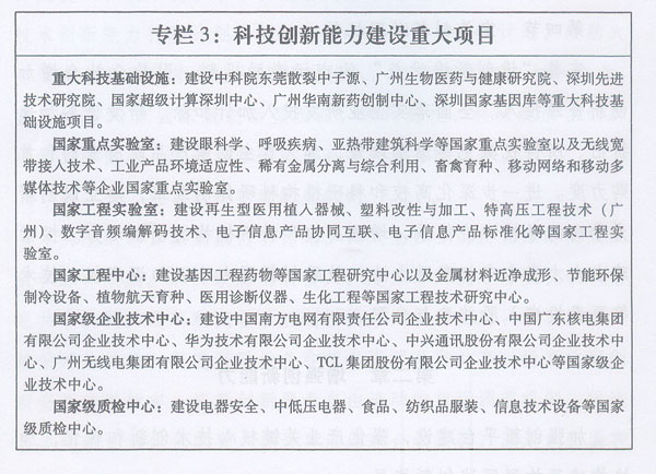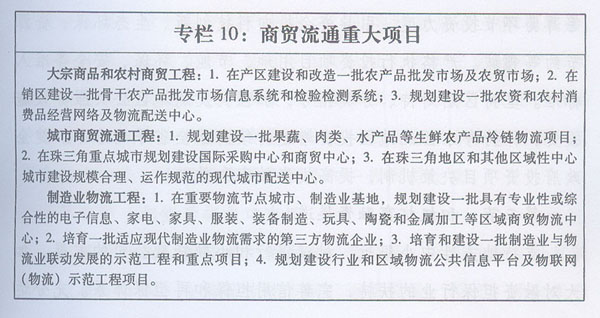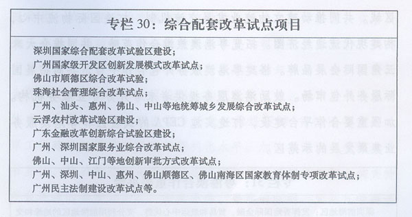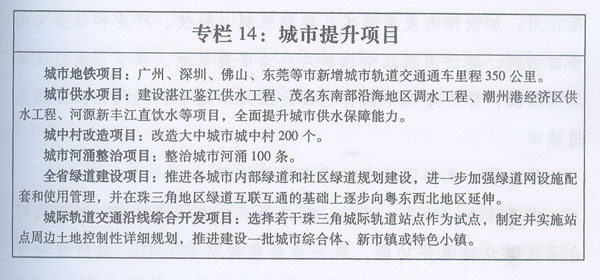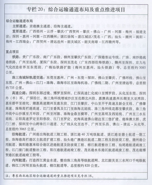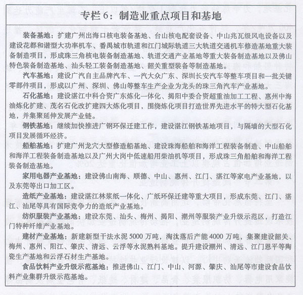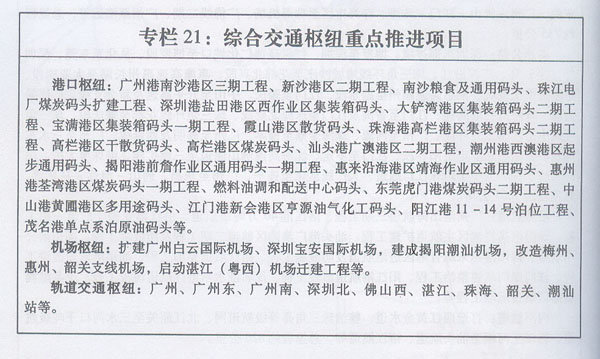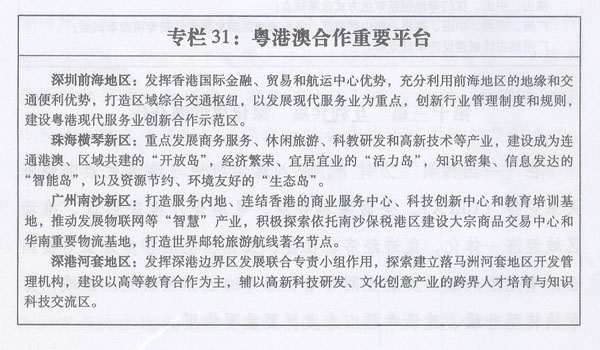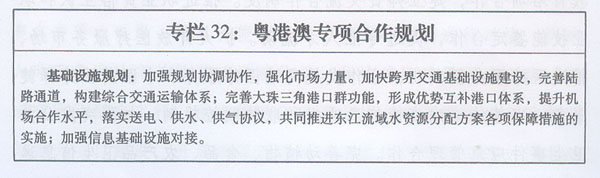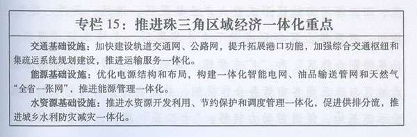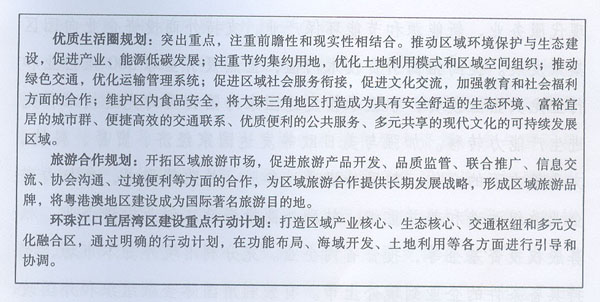 ? 第二章 加快跨界重大基礎(chǔ)設(shè)施建設(shè) ? 共同推進跨界重大基礎(chǔ)設(shè)施的規(guī)劃、建設(shè)和運營,加強與港澳在交通、口岸、信息、能源、城市供水等方面進行對接,構(gòu)建大珠三角發(fā)達完善的基礎(chǔ)設(shè)施體系。加快建設(shè)跨界高速公路、軌道交通及配套工程,重點推進港珠澳大橋、廣深港鐵路客運專線等重大項目建設(shè),開展港深西部快速軌道線的前期工作,形成無縫銜接、換乘便利的交通網(wǎng)。有效整合珠江口港口資源,完善大珠三角港口群功能,形成與香港港口分工明確、優(yōu)勢互補、共同發(fā)展的珠三角港口群。加強珠三角民航機場與香港、澳門機場的合作,完善機場聯(lián)席會議機制,構(gòu)筑優(yōu)勢互補、共同發(fā)展的機場體系。加強口岸綜合配套服務(wù)功能,推進蓮塘/香園圍等重點口岸工程建設(shè),提升口岸通關(guān)便利化水平。加快粵港澳電子簽名證書互認(rèn)、檢驗檢測報告互認(rèn),推進信息技術(shù)基礎(chǔ)設(shè)施和公共支持平臺資源的合作與共享。加強粵港、粵澳的電網(wǎng)、天然氣管網(wǎng)連接,推進對港澳供電、供氣配套工程建設(shè),增強能源供應(yīng)保障能力。加強供港澳的原水保障和水資源保護,推進水資源配置工程建設(shè)。 ? 第三章 共建大珠三角優(yōu)質(zhì)生活圈 ? 進一步完善區(qū)域空氣質(zhì)量監(jiān)測網(wǎng)絡(luò)和大氣復(fù)合污染防治體系,推進區(qū)域環(huán)境污染共防共治。繼續(xù)推進水資源、濕地、海洋生態(tài)的保護和跨界自然保護區(qū)、生態(tài)廊道的建設(shè)。加強高等教育合作,積極探索多種形式的合作辦學(xué)模式和運作方式。加強職業(yè)教育培訓(xùn)合作,建立師資交流合作制度。推進職業(yè)資格互認(rèn)和職業(yè)技能鑒定合作,促進專業(yè)人才流動。擴大開放醫(yī)療服務(wù)市場,推進醫(yī)療服務(wù)便利化,合作發(fā)展高端醫(yī)療服務(wù)和中醫(yī)藥醫(yī)療保健服務(wù)。完善傳染病疫情信息通報和聯(lián)防聯(lián)控機制,加強突發(fā)公共衛(wèi)生事件應(yīng)急管理合作。完善動植物、食品、農(nóng)產(chǎn)品衛(wèi)生信息通報,建立食品安全技術(shù)標(biāo)準(zhǔn)協(xié)調(diào)機制;加強藥品安全監(jiān)督的交流與合作。加強文化體育交流與合作。加強社會管理合作,在公共事務(wù)管理中積極引入港澳專業(yè)化社會服務(wù)模式,支持港澳服務(wù)提供者到廣東舉辦養(yǎng)老、殘疾人等社會福利機構(gòu)。加強司法和社會治安管理合作。完善應(yīng)急協(xié)調(diào)機制,建立突發(fā)性事件應(yīng)急管理合作體系。實施環(huán)珠江口宜居灣區(qū)重點行動計劃,共建宜居、便利、高效和服務(wù)先進的優(yōu)質(zhì)生活圈。 ? 第四章 完善和創(chuàng)新合作機制 ? 在中央有關(guān)部門的指導(dǎo)下,擴大粵港澳三方就合作事宜進行自主協(xié)商的范圍。按照協(xié)商一致的原則,共同編制、實施區(qū)域合作規(guī)劃。完善粵港、粵澳高層會晤和聯(lián)席會議機制,增強聯(lián)席會議推動合作的實效性。健全咨詢機制,拓寬咨詢渠道。促進民間合作,支持粵港、粵澳工商企業(yè)界、專業(yè)服務(wù)界、學(xué)術(shù)界等加強交流與合作。建立行業(yè)協(xié)會合作平臺,開展人員培訓(xùn)、資格互認(rèn)、行業(yè)自律等工作,共同制定區(qū)域行業(yè)規(guī)則。建立商貿(mào)協(xié)作機制,聯(lián)手向海內(nèi)外推介大珠三角,聯(lián)合參與區(qū)域和國際競爭。