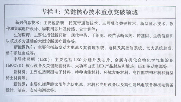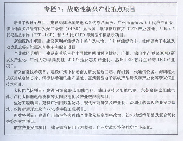 第二節(jié) 促進重點領(lǐng)域跨越發(fā)展 重點發(fā)展高端新型電子信息、新能源汽車、半導(dǎo)體照明三大產(chǎn)業(yè)。實施發(fā)展高端新型電子信息產(chǎn)業(yè)行動計劃,著力發(fā)展新型平板顯示、新一代通信、物聯(lián)網(wǎng)和云計算等新興行業(yè),加快廣州、深圳、佛山、汕尾等地的重大新型平板顯示項目建設(shè),推進新一代寬帶無線移動通信和下一代互聯(lián)網(wǎng)關(guān)鍵技術(shù)攻關(guān)和產(chǎn)品開發(fā),打造世界級電子信息產(chǎn)業(yè)基地。實施廣東省電動汽車發(fā)展行動計劃,以純電動汽車和插電式混合動力汽車為主要發(fā)展方向,重點發(fā)展整車生產(chǎn)項目。實施LED產(chǎn)業(yè)發(fā)展和提升計劃,大力發(fā)展大功率LED前端產(chǎn)品及裝備,開發(fā)新一代綠色環(huán)保燈具,加快發(fā)展佛山、江門、中山等市LED產(chǎn)業(yè)集群。 第三節(jié) 突破產(chǎn)業(yè)關(guān)鍵環(huán)節(jié) 抓住技術(shù)、市場、產(chǎn)業(yè)組織和政策環(huán)境等關(guān)鍵環(huán)節(jié),集中力量形成突破。加強關(guān)鍵領(lǐng)域核心技術(shù)的研發(fā)及產(chǎn)業(yè)化,以技術(shù)突破帶動產(chǎn)業(yè)升級;加強新興技術(shù)儲備,在新一代通信、新能源汽車、半導(dǎo)體照明、太陽能光伏等新興技術(shù)領(lǐng)域?qū)崿F(xiàn)與國際同步發(fā)展。加快我省12個國家高技術(shù)產(chǎn)業(yè)基地和9個國家高新區(qū)建設(shè),培育建設(shè)一批戰(zhàn)略性新興產(chǎn)業(yè)示范基地。加快制定實施促進新興產(chǎn)業(yè)發(fā)展的政策措施。拓寬戰(zhàn)略性新興產(chǎn)業(yè)產(chǎn)品市場,以市場應(yīng)用帶動產(chǎn)業(yè)發(fā)展。積極推進新能源汽車充電、充氣設(shè)施建設(shè),建設(shè)一批新能源汽車推廣應(yīng)用示范城市,積極推進新能源汽車在城市公共服務(wù)領(lǐng)域的應(yīng)用。實施LED照明和金太陽等一批示范工程,建設(shè)廣東省綠色照明示范城市。