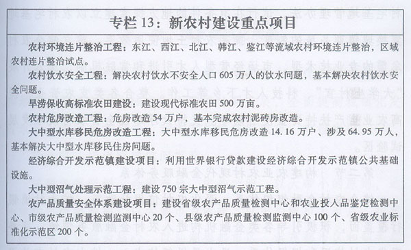 ? 第二章 努力增加農(nóng)民收入 ? 加大支持力度,完善幫扶制度,拓寬農(nóng)民增收渠道,提高農(nóng)民農(nóng)業(yè)生產(chǎn)收入,努力使農(nóng)民工資性、轉(zhuǎn)移性、財產(chǎn)性收入獲得較快增長。 第一節(jié) 促進農(nóng)民轉(zhuǎn)移就業(yè) 加大農(nóng)村富余勞動力轉(zhuǎn)移就業(yè)力度。加強農(nóng)民職業(yè)技能和創(chuàng)業(yè)能力培訓(xùn),實施農(nóng)村高技能人才培養(yǎng)工程和基本技能培訓(xùn)工程,力爭實現(xiàn)全省農(nóng)村中等職業(yè)教育免費。構(gòu)建城鄉(xiāng)一體、覆蓋全省、簡單易用的就業(yè)信息平臺,提高農(nóng)民外出務(wù)工擇業(yè)效率。清理城鄉(xiāng)勞動者差別性就業(yè)政策,努力實現(xiàn)農(nóng)民工與城鎮(zhèn)就業(yè)人員同工同酬。 第二節(jié) 加大制度性補助力度 穩(wěn)步提高主要農(nóng)產(chǎn)品收購價格,堅持對種糧農(nóng)民實行直接補貼,繼續(xù)實行良種補貼和農(nóng)機具購置補貼,完善農(nóng)資綜合補貼動態(tài)調(diào)整機制,提高補貼標(biāo)準(zhǔn)。逐步提高農(nóng)村社會保障水平,提高新型農(nóng)村合作醫(yī)療籌資和報銷水平,增加新型農(nóng)村社會養(yǎng)老保險基礎(chǔ)養(yǎng)老金。擴寬籌資渠道,上調(diào)扶貧補助標(biāo)準(zhǔn)。提高農(nóng)村最低生活保障水平,擴大農(nóng)村家庭生活補助覆蓋面。完善農(nóng)村災(zāi)民救助制度和重大疾病防控制度。逐步建立耕地和永久基本農(nóng)田經(jīng)濟補償制度。 第三節(jié) 擴大財產(chǎn)增收途徑 鼓勵農(nóng)民以轉(zhuǎn)包、出租、互換、轉(zhuǎn)讓、股份合作等形式流轉(zhuǎn)土地承包經(jīng)營權(quán),確保農(nóng)民土地權(quán)益流轉(zhuǎn)收益應(yīng)享盡享。按照同地同價、保障權(quán)益原則,健全被征地農(nóng)民的征地補償機制。全面完成集體林權(quán)制度改革,推進國有林區(qū)林權(quán)制度改革,鼓勵和推動林地經(jīng)營權(quán)、林木所有權(quán)合理流轉(zhuǎn)。開展水權(quán)和海權(quán)等體制改革和經(jīng)營方式改革試點,拓寬農(nóng)民用益物權(quán)領(lǐng)域。積極探索推進農(nóng)村資產(chǎn)要素市場化,發(fā)展農(nóng)村投資理財服務(wù),釋放農(nóng)民財產(chǎn)性增收潛力。 ? 第三章 大力推進宜居鄉(xiāng)村建設(shè) ? 加強農(nóng)村規(guī)劃建設(shè),注重整潔衛(wèi)生、環(huán)境保護,提高農(nóng)村土地利用效率,建設(shè)具有嶺南特色的生態(tài)宜居的社會主義新農(nóng)村。 第一節(jié) 優(yōu)化農(nóng)村建設(shè)布局 堅持發(fā)展、保護與文化傳承相協(xié)調(diào),科學(xué)編制村鎮(zhèn)規(guī)劃,促進村鎮(zhèn)內(nèi)部合理分區(qū)和公共服務(wù)設(shè)施合理布點,加強與外部基礎(chǔ)設(shè)施的銜接,推動名鎮(zhèn)名村建設(shè)試點。建立健全新農(nóng)村建設(shè)示范、扶持、激勵機制,開展“萬村百鎮(zhèn)”整治,因地制宜拆除空心村、合并小型村,規(guī)范對農(nóng)民自建房的建設(shè)管理,努力打造安居、康居、樂居并具有嶺南特色的宜居村鎮(zhèn)。以縣為單位,每年推進10%建制鎮(zhèn)和自然村整治建設(shè),到2015年完成全省一半以上的鎮(zhèn)村整治。 第二節(jié) 加強農(nóng)村基礎(chǔ)設(shè)施建設(shè) 提高農(nóng)村地區(qū)公共基礎(chǔ)設(shè)施和公共服務(wù)的財力保障水平。以農(nóng)村道路、清潔能源、飲水安全、農(nóng)田水利、信息暢通為重點,促進城市的公共基礎(chǔ)設(shè)施建設(shè)向農(nóng)村延伸,形成城鄉(xiāng)銜接的公共基礎(chǔ)設(shè)施及公共服務(wù)網(wǎng)絡(luò),改善農(nóng)村生產(chǎn)生活條件。加快農(nóng)村出行公交化步伐,建成覆蓋城鄉(xiāng)、快速便捷的公交客運網(wǎng)絡(luò)。提高可再生能源在農(nóng)村能源結(jié)構(gòu)中的比重,積極推廣沼氣、小水電、風(fēng)能、太陽能等環(huán)保型能源,繼續(xù)推進農(nóng)村電網(wǎng)改造工程。加快建設(shè)與城鎮(zhèn)供水網(wǎng)聯(lián)接的農(nóng)村飲水安全工程,大力推進村村通自來水,讓老百姓喝上干凈水、放心水。實施新一輪水電新農(nóng)村電氣化建設(shè)。加大農(nóng)用地整理開墾力度,加快旱澇保收高標(biāo)準(zhǔn)農(nóng)田和標(biāo)準(zhǔn)魚塘建設(shè)。加強農(nóng)村信息化建設(shè)。 第三節(jié) 改善農(nóng)村環(huán)境衛(wèi)生 全面推進“五改”、“三清”和“五有”①等整治和建設(shè),促進農(nóng)村人居環(huán)境和村容村貌根本改觀。開展農(nóng)村衛(wèi)生清潔行動,加快建設(shè)農(nóng)村垃圾、污水處理系統(tǒng),實現(xiàn)農(nóng)村廢棄物和人畜糞便無害化處理。參照市政模式,設(shè)立村級環(huán)衛(wèi)隊伍,建立農(nóng)村生活垃圾“戶分類、村收集、鎮(zhèn)轉(zhuǎn)運、縣處理”的長效清潔機制。大力加強農(nóng)村公共衛(wèi)生宣傳力度,引導(dǎo)和幫助廣大農(nóng)民形成良好的衛(wèi)生習(xí)慣和健康文明的生活方式。