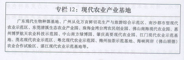 ? ? 第五篇 強農(nóng)惠農(nóng) 建設(shè)美好新農(nóng)村 ? 把解決“三農(nóng)”問題作為加快轉(zhuǎn)型升級、建設(shè)幸福廣東的重要基礎(chǔ),協(xié)調(diào)推進工業(yè)化、城鎮(zhèn)化和農(nóng)業(yè)農(nóng)村現(xiàn)代化,建設(shè)現(xiàn)代農(nóng)業(yè)強省,不斷增加農(nóng)民收入,建設(shè)優(yōu)美富足的幸福新農(nóng)村。 ? 第一章 積極發(fā)展現(xiàn)代農(nóng)業(yè) ? 發(fā)揮資源優(yōu)勢,突出地方特色,提高農(nóng)業(yè)現(xiàn)代化水平,保障主要農(nóng)產(chǎn)品供應(yīng),走高效、生態(tài)、安全的發(fā)展道路,確?!懊状印?、“菜籃子”安全。 第一節(jié) 增強農(nóng)業(yè)綜合生產(chǎn)能力 按照“四區(qū)、兩帶”的農(nóng)業(yè)開發(fā)戰(zhàn)略格局①,優(yōu)化全省農(nóng)業(yè) ———————— ?、?/span>“四區(qū)”包括珠三角都市農(nóng)業(yè)區(qū)、潮汕平原精細(xì)農(nóng)業(yè)區(qū)、粵西熱帶農(nóng)業(yè)區(qū)和北部山地生態(tài)農(nóng)業(yè)區(qū)。“兩帶”包括沿海海水增、養(yǎng)殖農(nóng)業(yè)帶和南亞熱帶農(nóng)業(yè)帶。 ? 產(chǎn)業(yè)與區(qū)域布局,扶持形成若干片優(yōu)勢突出的糧食、甘蔗、水產(chǎn)等大宗農(nóng)產(chǎn)品主產(chǎn)區(qū)。積極扶持國家級、省級產(chǎn)糧大縣生產(chǎn)建設(shè),提高糧食、蔬菜、水果、畜禽等的生產(chǎn)能力,穩(wěn)步增加主要農(nóng)產(chǎn)品生產(chǎn)供應(yīng),全省年糧食產(chǎn)量不低于1300萬噸。嚴(yán)格保護耕地,確?;巨r(nóng)田面積不低于255.6萬公頃。大力發(fā)展特色效益農(nóng)業(yè),壯大園藝產(chǎn)業(yè)、南亞熱帶農(nóng)業(yè)、高端畜禽水產(chǎn)養(yǎng)殖和遠洋漁業(yè),創(chuàng)響“嶺南佳品”名牌。積極發(fā)展現(xiàn)代林業(yè)產(chǎn)業(yè),擴大油茶種植面積,培育珍貴樹木產(chǎn)業(yè),加快發(fā)展林產(chǎn)品深加工。拓展農(nóng)業(yè)功能,提升休閑觀光農(nóng)業(yè)發(fā)展水平。到2015年,初步建成具有嶺南特色和南亞熱帶特色的現(xiàn)代都市型、外向型、生態(tài)型現(xiàn)代農(nóng)業(yè)體系。 第二節(jié) 提高農(nóng)業(yè)發(fā)展水平 按照高端化、標(biāo)準(zhǔn)化、規(guī)?;⒓s化的現(xiàn)代農(nóng)業(yè)經(jīng)營方式改造提升傳統(tǒng)農(nóng)業(yè)。全面提升農(nóng)業(yè)科技創(chuàng)新能力,積極發(fā)展現(xiàn)代種業(yè),重點支持種質(zhì)資源、良種繁育、重要農(nóng)產(chǎn)品加工保鮮技術(shù)、農(nóng)業(yè)資源綜合利用等領(lǐng)域的科技創(chuàng)新,深化農(nóng)業(yè)科技推廣體系改革。加強農(nóng)產(chǎn)品技術(shù)標(biāo)準(zhǔn)體系建設(shè)、地理標(biāo)志產(chǎn)品保護、原產(chǎn)地標(biāo)志認(rèn)定和綠色有機農(nóng)產(chǎn)品認(rèn)證工作。完善農(nóng)技推廣、疫病防控、質(zhì)量監(jiān)管、產(chǎn)品溯源等農(nóng)業(yè)公共服務(wù)體系。加強農(nóng)產(chǎn)品批發(fā)市場和冷鏈等現(xiàn)代物流體系建設(shè)。推動龍頭企業(yè)與農(nóng)民建立緊密的利益關(guān)系,培育農(nóng)民新型合作組織,扶持發(fā)展專業(yè)大戶、家庭農(nóng)場和農(nóng)民專業(yè)合作社等規(guī)模經(jīng)營主體。加強農(nóng)產(chǎn)品綜合利用開發(fā),引導(dǎo)優(yōu)勢農(nóng)產(chǎn)品產(chǎn)業(yè)鏈延伸。加快建設(shè)現(xiàn)代農(nóng)業(yè)示范基地。全面提升農(nóng)業(yè)物質(zhì)裝備綜合水平,力爭到2015年,全省農(nóng)機總動力達到2700萬千瓦,水稻耕種收綜合機械化水平達到65%,水產(chǎn)養(yǎng)殖機械覆蓋率達到80%以上。