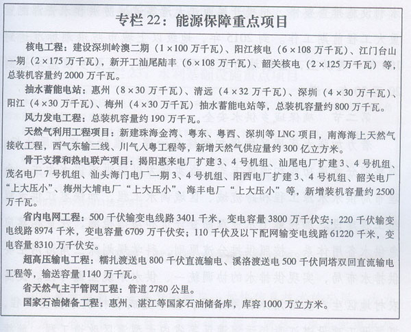 ? 第四節(jié) 推動交通運輸結(jié)構(gòu)優(yōu)化調(diào)整 優(yōu)先發(fā)展公共交通,提高公共交通出行比重。發(fā)展大運量公共交通,提高公共交通線網(wǎng)密度和站點覆蓋率。加快建設(shè)干線鐵路網(wǎng)和珠三角地區(qū)城際軌道交通網(wǎng),實現(xiàn)珠三角城際客運公交化,規(guī)劃適時啟動建設(shè)粵東城際軌道交通網(wǎng)。穩(wěn)步發(fā)展公路交通,提高公路網(wǎng)等級和通達深度,發(fā)展農(nóng)村公路客運。發(fā)展聯(lián)程聯(lián)運,提升民航服務(wù)水平和競爭力,積極發(fā)展通用航空。加大對內(nèi)河航運發(fā)展的資金和政策支持,推進高等級內(nèi)河航道建設(shè),促進內(nèi)河航運與沿海樞紐港協(xié)同發(fā)展。圍繞交通基礎(chǔ)設(shè)施建設(shè)發(fā)展裝備制造產(chǎn)業(yè),有效提升產(chǎn)業(yè)配套服務(wù)能力。 ? 第二章 構(gòu)建清潔能源保障體系 ? 以能源結(jié)構(gòu)調(diào)整為中心,優(yōu)化能源結(jié)構(gòu),提升清潔能源比重,促進能源綠色生產(chǎn)和清潔利用,構(gòu)建安全、穩(wěn)定、經(jīng)濟、清潔的能源供應(yīng)保障體系。 第一節(jié) 加強能源供應(yīng)基礎(chǔ)設(shè)施建設(shè) 加快發(fā)展核電,優(yōu)化發(fā)展火電,適度建設(shè)抽水蓄能電站、天然氣發(fā)電等調(diào)峰電源,積極發(fā)展風(fēng)電、太陽能光伏發(fā)電等可再生能源。合理布局建設(shè)工(產(chǎn))業(yè)園區(qū)熱電冷聯(lián)供項目和分布式能源項目(包括儲能電站等),在珠三角區(qū)內(nèi)負(fù)荷中心建設(shè)環(huán)保型支撐電源,在沿海沿江建設(shè)一批骨干電廠。加強油品和天然氣供應(yīng)設(shè)施建設(shè),在沿海建設(shè)重大煉化項目,多渠道拓展天然氣資源,推進陸上氣源、沿海LNG接收站和海上天然氣上岸工程建設(shè)。到2015年,全省接收西電東送最大電力約3600萬千瓦,省內(nèi)電力裝機容量達到約10000萬千瓦(其中核電裝機容量達到1380萬千瓦,風(fēng)電裝機容量250萬千瓦;清潔電源所占比重達到40%左右),天然氣供應(yīng)能力超過400億立方米/年,非化石能源占全省一次能源消費比重達到20%。 第二節(jié) 完善能源輸送網(wǎng)絡(luò) 繼續(xù)加大電網(wǎng)建設(shè)投入,優(yōu)化電網(wǎng)結(jié)構(gòu),提高供電可靠性,促進電源電網(wǎng)協(xié)調(diào)發(fā)展,提升電網(wǎng)承接各類型電源接入能力和抗災(zāi)減災(zāi)能力。加強各電壓等級電網(wǎng)建設(shè),全面推進城鄉(xiāng)配電網(wǎng)升級改造,推廣智能微網(wǎng)和儲能技術(shù)等新技術(shù)和新設(shè)備應(yīng)用,建設(shè)區(qū)域智能電網(wǎng)試點工程。進一步完善成品油管道建設(shè),形成連接煉油中心、主要消費城市、成品油儲備基地,貫穿全省的成品油輸送干線,增強成品油供應(yīng)能力和應(yīng)急保障能力。加快建設(shè)連接各主要氣源點、以珠三角地區(qū)為中心、通達全省各地級以上市的天然氣主干管網(wǎng)。到2015年,全省形成結(jié)構(gòu)合理、安全可靠、先進節(jié)能、適度超前的現(xiàn)代化綠色電網(wǎng),油品供應(yīng)管道和天然氣供應(yīng)管道里程分別達到2900公里和3300公里。 第三節(jié) 加強能源儲備和中轉(zhuǎn)基地建設(shè) 加快建設(shè)粵東、粵西大型煤炭中轉(zhuǎn)基地。積極推進國家原油儲備基地建設(shè),加快推進天然氣儲備基礎(chǔ)設(shè)施建設(shè),完善油氣儲備體系。加強省內(nèi)鈾資源勘查,提高我省核電發(fā)展的鈾資源支撐能力。加強主要能源品種供需情況預(yù)測預(yù)警。依托能源基礎(chǔ)設(shè)施,建設(shè)全國重要的能源產(chǎn)業(yè)基地。 ?