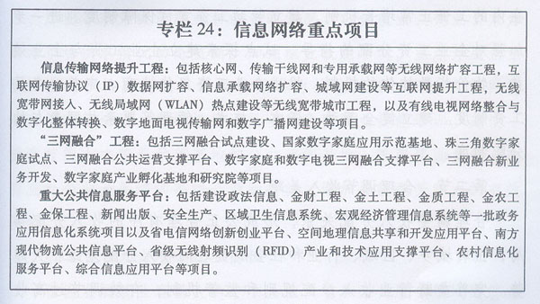 ? 第四章 優(yōu)化高效信息網(wǎng)絡(luò)體系 ? 以信息資源整合共享為突破口,加快信息技術(shù)的應(yīng)用,大力建設(shè)開放融合的信息網(wǎng)絡(luò)體系和信息服務(wù)網(wǎng)絡(luò),率先實現(xiàn)電信網(wǎng)、廣播電視網(wǎng)和互聯(lián)網(wǎng)“三網(wǎng)融合”,建設(shè)“智慧廣東”。到2015年,全省信息化總體達到中等發(fā)達國家水平,珠三角邁向全球信息化先進水平行列。 第一節(jié) 優(yōu)化提升信息傳輸網(wǎng)絡(luò) 加強各類信息網(wǎng)絡(luò)的統(tǒng)籌規(guī)劃、建設(shè)和管理,強化網(wǎng)絡(luò)與信息安全保障,探索有效的共建共享機制。大力發(fā)展新一代移動通信網(wǎng)和下一代互聯(lián)網(wǎng),加快寬帶光纖接入,優(yōu)化提升通信網(wǎng)絡(luò)。以新一代寬帶無線移動通信技術(shù)為主要手段,加快建設(shè)覆蓋珠三角、連接粵港澳的無線寬帶城市群。加快全省有線電視網(wǎng)絡(luò)雙向數(shù)字化改造,推進數(shù)字廣播網(wǎng)建設(shè),推動形成全省統(tǒng)一的有線數(shù)字廣播電視網(wǎng)絡(luò)。加快發(fā)展物聯(lián)網(wǎng),推動物聯(lián)網(wǎng)關(guān)鍵技術(shù)研發(fā)和在重點領(lǐng)域的應(yīng)用示范。完善信息安全標(biāo)準(zhǔn)體系和認(rèn)證認(rèn)可體系,加強信息網(wǎng)絡(luò)監(jiān)測、管控能力建設(shè)。到2015年,全省互聯(lián)網(wǎng)普及率達70%以上。 第二節(jié) 加快推進“三網(wǎng)融合” 以廣播電視和電信業(yè)務(wù)雙向進入為重點,加快國家級“三網(wǎng)融合”試點城市建設(shè),統(tǒng)一相關(guān)標(biāo)準(zhǔn)和技術(shù)規(guī)范,探索多種運營模式和試點組織方式,加快推進三網(wǎng)的高速互聯(lián)以及業(yè)務(wù)應(yīng)用的融合。構(gòu)建開放式產(chǎn)業(yè)合作平臺,促進“三網(wǎng)融合”新業(yè)務(wù)的開發(fā)及推廣,積極打造“三網(wǎng)融合”和數(shù)字家庭產(chǎn)業(yè)發(fā)展示范區(qū)。 第三節(jié) 逐步提高公共信息服務(wù)水平 加強信息資源共享,構(gòu)建系統(tǒng)布局、層次分明的公共信息服務(wù)平臺。實施商務(wù)電子化工程,建設(shè)便捷、高效的電子商務(wù)公共平臺,推進電子商務(wù)在生產(chǎn)、流通和消費等領(lǐng)域的深入應(yīng)用。實施電子政務(wù)暢通工程,建設(shè)政府信息資源共享平臺。實施公共信息服務(wù)共享工程,完善人口、地理空間、科教、衛(wèi)生等基礎(chǔ)性信息資源共享平臺。實施網(wǎng)絡(luò)民生民情工程,逐步完善“社保醫(yī)保一卡通”、“交通信息化平臺”等公共服務(wù)平臺,推進公共服務(wù)在線化。