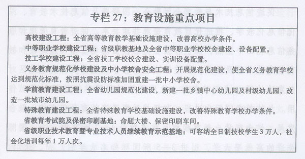 ? 第十一篇 內(nèi)涵提升 提高文化軟實力 ? 優(yōu)先發(fā)展教育,打造我國南方教育高地,建設(shè)區(qū)域文化中心,推動文化大發(fā)展大繁榮,努力滿足人民群眾不斷增長的精神文化需求,為加快轉(zhuǎn)型升級、建設(shè)幸福廣東增強活力。 ? 第一章 建立高質(zhì)量教育體系 ? 堅持教育的公益性和普惠性,統(tǒng)籌推進各級各類教育協(xié)調(diào)發(fā)展,著力促進教育公平,全面提高教育發(fā)展質(zhì)量。 第一節(jié) 加快普及學(xué)前到高中階段教育 大力促進珠三角市域、其他地區(qū)縣(市、區(qū))域的義務(wù)教育均衡化發(fā)展。以農(nóng)村為重點加快教育設(shè)施建設(shè),優(yōu)化中小學(xué)布局,建設(shè)義務(wù)教育規(guī)范化學(xué)校和鄉(xiāng)鎮(zhèn)中心幼兒園,著力改善農(nóng)村幼兒園、中小學(xué)的辦學(xué)條件。探索實施農(nóng)民工子女免費義務(wù)教育。加快特殊教育學(xué)校建設(shè)進程,提高殘疾兒童少年受教育水平。到2015年,全省普及學(xué)前到高中階段15年教育,各縣(市、區(qū))高中階段教育毛入學(xué)率均達到85%以上。 第二節(jié) 發(fā)展壯大職業(yè)教育 適應(yīng)我省現(xiàn)代產(chǎn)業(yè)體系的發(fā)展趨勢,率先建立起覆蓋中等職業(yè)教育、高等職業(yè)教育、應(yīng)用型本科教育、專業(yè)學(xué)位研究生教育的現(xiàn)代職業(yè)教育體系。著力加強現(xiàn)代技工教育體系建設(shè)。健全技能型人才培養(yǎng)機制,加快推進中等職業(yè)教育基礎(chǔ)能力建設(shè)和教學(xué)改革工程,逐步擴大免費中等職業(yè)教育范圍。以建設(shè)省級職業(yè)教育基地和國家級技工教育示范基地為核心,打造我國南方重要的職業(yè)教育基地。到2015年,全省各級各類職業(yè)教育在校生達到300萬人以上。 第三節(jié) 提升高等教育發(fā)展水平 保持高等教育規(guī)模合理增長,加強高水平大學(xué)和重點學(xué)科建設(shè)。優(yōu)化高等教育專業(yè)、層次、區(qū)域間的布局結(jié)構(gòu),明確省內(nèi)各大學(xué)園區(qū)(城)的定位,實現(xiàn)優(yōu)勢互補,促進高等教育規(guī)模、結(jié)構(gòu)、質(zhì)量、效益、特色協(xié)調(diào)發(fā)展,增強高校培養(yǎng)人才、創(chuàng)新科技、引領(lǐng)文化和服務(wù)社會的能力。 第四節(jié) 加強終身教育體系建設(shè) 推動學(xué)習(xí)型社會建設(shè)。推進教育資源社會共享,擴大現(xiàn)代遠程教育規(guī)模,加強覆蓋城鄉(xiāng)的社區(qū)教育機構(gòu)和網(wǎng)絡(luò)建設(shè),開展針對職業(yè)、生活的繼續(xù)教育和培訓(xùn)。促進學(xué)歷教育和非學(xué)歷教育協(xié)調(diào)發(fā)展、職業(yè)教育和普通教育相互溝通、職前教育和職后教育有效銜接,不斷完善終身教育體系。到2015年,社會新增勞動力平均受教育年限達到14年。