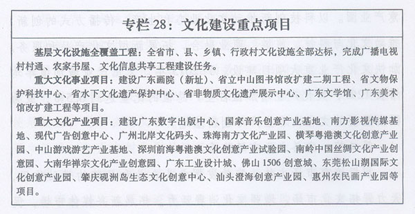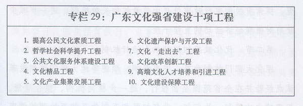 ? 第二章 完善教育發(fā)展支撐體系 ? 突出高素質(zhì)師資隊伍建設(shè),推進教育改革、開放、創(chuàng)新,提高教育現(xiàn)代化水平,推動教育事業(yè)科學(xué)發(fā)展。 第一節(jié) 加強高素質(zhì)教師隊伍建設(shè) 以提升教師能力素質(zhì)為核心,以農(nóng)村教師隊伍、職業(yè)教育“雙師型”教師隊伍、高校高層次人才隊伍建設(shè)為重點,立足培養(yǎng)、加快引進、優(yōu)化環(huán)境、健全機制,建設(shè)一支數(shù)量充足、結(jié)構(gòu)合理、素質(zhì)優(yōu)良、充滿活力的教師隊伍。著力提高欠發(fā)達地區(qū)和農(nóng)村教師工資和福利水平,促進城鄉(xiāng)師資均衡配置和資源共享。加強高層次師資交流培訓(xùn)。 第二節(jié) 提升教育信息化和開放合作水平 促進信息技術(shù)與教育全面融合,圍繞普及信息技術(shù)教育、深化信息化教學(xué)、推進優(yōu)質(zhì)教育資源共建共享、促進教育管理和服務(wù)信息化四個重點,加快各級各類學(xué)校信息化基礎(chǔ)設(shè)施建設(shè)和教育信息技術(shù)普及應(yīng)用。推進區(qū)域教育合作,充分發(fā)揮發(fā)達地區(qū)對欠發(fā)達地區(qū)、城市對農(nóng)村、優(yōu)質(zhì)學(xué)校對薄弱學(xué)校的輻射帶動作用。加快教育國際化進程,積極推動粵港澳教育緊密合作、融合發(fā)展,擴大留學(xué)生教育規(guī)模。重點建設(shè)1—2所國內(nèi)一流、國際先進的高水平大學(xué),引進3—5所國際知名大學(xué)到廣州、深圳、珠海、東莞、佛山等城市合作舉辦高等教育機構(gòu),提升國際合作層次和水平。 第三節(jié) 深化教育體制改革 推進管辦評分離,依法保障學(xué)校充分行使辦學(xué)自主權(quán),形成政事分開、權(quán)責(zé)明確、統(tǒng)籌協(xié)調(diào)、規(guī)范有序的教育管理體制。堅持教育公益性原則,健全政府主導(dǎo)、社會參與和監(jiān)督、辦學(xué)主體多元的辦學(xué)體制;鼓勵社會力量參與公辦學(xué)校辦學(xué),落實民辦學(xué)校與公辦學(xué)校平等的法律地位,促進和規(guī)范民辦教育發(fā)展;加大財政投入,拓寬經(jīng)費來源,改善支出結(jié)構(gòu),提高教育經(jīng)費使用效益。調(diào)整優(yōu)化高等院校學(xué)科結(jié)構(gòu)和專業(yè)設(shè)置。改革考試招生制度。探索建立現(xiàn)代大學(xué)制度。全面實施素質(zhì)教育,創(chuàng)新教學(xué)內(nèi)容、方法和評價制度,促進學(xué)生德智體美全面發(fā)展。 ? 第三章 健全公共文化服務(wù)體系 ? 加大財政投入,建設(shè)結(jié)構(gòu)合理、功能完善、網(wǎng)絡(luò)健全、運行有效、惠及全民的公共文化服務(wù)體系。 第一節(jié) 完善公共文化基礎(chǔ)設(shè)施 實施基層文化設(shè)施全覆蓋工程,在城市建設(shè)“10分鐘文化圈”,在農(nóng)村建設(shè)“十里文化圈”。到2015年,全省市、縣圖書館、文化館、博物館、鄉(xiāng)鎮(zhèn)綜合文化站、行政村(社區(qū))文化設(shè)施全部達標(biāo),珠三角地區(qū)達到全國一流水平。推進重大文化工程建設(shè),提升非物質(zhì)文化遺產(chǎn)保護展示、水下文物保護、文學(xué)藝術(shù)創(chuàng)作等方面基礎(chǔ)設(shè)施水平。加大廣播電視村村通、城鎮(zhèn)電影院線、市縣檔案館、農(nóng)家書屋、文化信息共享工程等的建設(shè)力度。 第二節(jié) 實施重點文化惠民工程 實施公共文化進村入戶工程,采取多種形式,將文藝作品送到基層。整合全省文化資源,推動數(shù)字圖書館聯(lián)盟、公共圖書館聯(lián)盟和演藝聯(lián)盟,促進文化項目共建共享。提高公共文化設(shè)施的使用效益,增加公共文化產(chǎn)品的免費或低價項目。繼續(xù)推進電影下鄉(xiāng)活動,加大農(nóng)村電影放映工程建設(shè)力度。 第三節(jié) 增強文化產(chǎn)品和服務(wù)供給能力 加強公共文化服務(wù)資源建設(shè),采取政府購買、項目補貼、委托生產(chǎn)等形式,鼓勵文化單位生產(chǎn)質(zhì)優(yōu)價廉的公共文化產(chǎn)品。建設(shè)覆蓋城鄉(xiāng)的流動圖書館、流動博物館、流動演出網(wǎng),推動公共文化服務(wù)向社區(qū)和農(nóng)村延伸。構(gòu)建先進的現(xiàn)代文化傳播體系。鼓勵和支持成立各類民間文化社團。 ? 第四章 加快發(fā)展文化產(chǎn)業(yè) ? 深化文化體制改革,優(yōu)化產(chǎn)業(yè)結(jié)構(gòu),完善市場體系,促進文化產(chǎn)業(yè)的健康持續(xù)發(fā)展,保持鞏固文化產(chǎn)業(yè)在全國的領(lǐng)先優(yōu)勢。 第一節(jié) 壯大文化產(chǎn)業(yè) 做大做強以創(chuàng)意為特征的文化服務(wù)業(yè),重點發(fā)展文化創(chuàng)意、平面?zhèn)髅健V播影視、出版發(fā)行、動漫、游戲游藝、演藝娛樂、文化會展等產(chǎn)業(yè)。培育新一代網(wǎng)絡(luò)游戲、數(shù)字內(nèi)容、新型媒體終端等高增長性產(chǎn)業(yè),建設(shè)國家(深圳、汕頭)及省級動漫產(chǎn)業(yè)基地、東莞松山湖創(chuàng)意產(chǎn)業(yè)園等文化創(chuàng)意園區(qū),打造嶺南文化創(chuàng)意產(chǎn)業(yè)圈。以科技創(chuàng)新推動文化業(yè)態(tài)和生產(chǎn)、傳播方式的創(chuàng)新,推動文化與科技、旅游、商業(yè)融合,拓展新型文化產(chǎn)品和服務(wù)。加快文化產(chǎn)業(yè)重大項目建設(shè)。到2015年,文化產(chǎn)