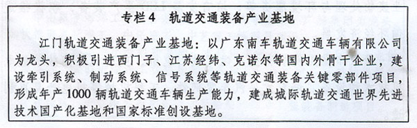 (四)軌道交通裝備。 以江門市為主,依托珠三角城際軌道交通網(wǎng)絡(luò)建設(shè),重點發(fā)展軌道交通裝備及其關(guān)鍵系統(tǒng)零部件,建立健全研發(fā)設(shè)計、生產(chǎn)制造和產(chǎn)品標準、知識產(chǎn)權(quán)保護體系,提升裝備自主化能力。加快延伸產(chǎn)業(yè)鏈,大力提高整車配套和生產(chǎn)能力。研究開發(fā)磁懸浮、真空管道等超高速軌道交通技術(shù)及相關(guān)裝備。到2017年,形成1000輛軌道交通車輛年生產(chǎn)能力。到2020年,建成世界一流的高端軌道交通裝備修造產(chǎn)業(yè)基地。