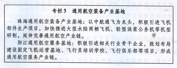 以珠海市為主,以低空領(lǐng)域開放為契機,重點發(fā)展航空關(guān)鍵技術(shù)研發(fā),以及通用飛機、水上飛機、無人機、特種飛行器和輕型直升機等,積極發(fā)展機場空管導航監(jiān)視裝備和牽引車、氣源車、電源車和空調(diào)車等機場地勤設(shè)備。研究開發(fā)地效飛行器、通用航空發(fā)動機等高端航空裝備。到2017年,培育壯大1家通航裝備制造企業(yè)。到2020年,成為國內(nèi)主要通用航空產(chǎn)業(yè)基地之一。
