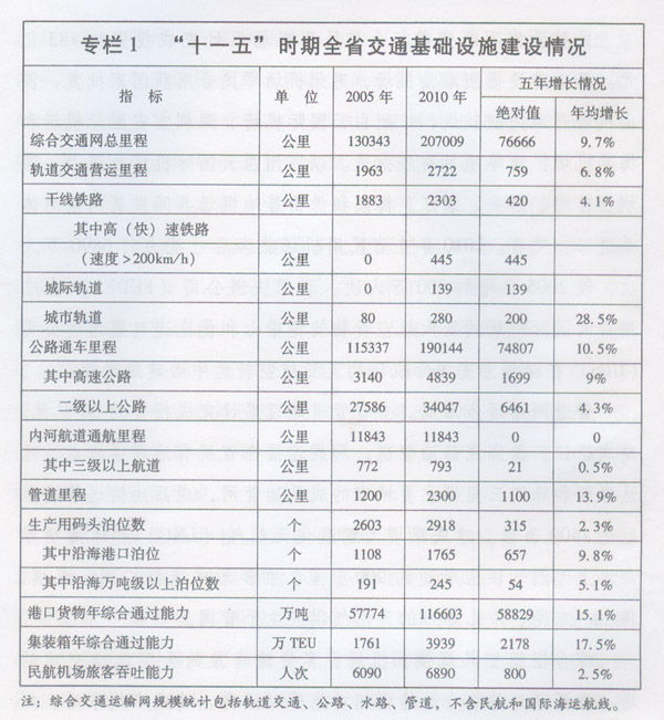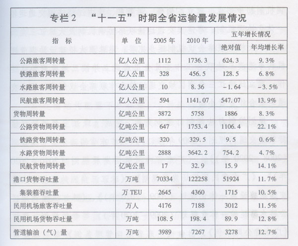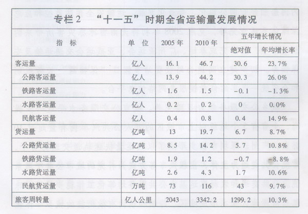 ? 2.運(yùn)輸服務(wù)水平穩(wěn)步提升。 運(yùn)輸一體化加速推進(jìn)。毗鄰地級(jí)以上市公交互聯(lián)互通和短途客運(yùn)班車公交化改造扎實(shí)推進(jìn)。全省提前3年完成撤銷政府還貸二級(jí)公路收費(fèi)站任務(wù)。廣佛肇、珠中江經(jīng)濟(jì)圈實(shí)現(xiàn)車輛通行費(fèi)年票互認(rèn)互通,全省公交“一卡通”工作全面展開。廣州港與虎門港初步實(shí)現(xiàn)引航一體化。不同運(yùn)輸方式之間的銜接進(jìn)一步增強(qiáng)。 運(yùn)輸裝備水平大幅提升。廣深鐵路建成我國(guó)第一條客貨分線運(yùn)輸?shù)乃木€電氣化鐵路,客運(yùn)列車實(shí)現(xiàn)完全公交化運(yùn)營(yíng);武廣客運(yùn)專線開通運(yùn)營(yíng),成為世界上第一條時(shí)速350公里的無(wú)砟軌道長(zhǎng)大客運(yùn)專線。公路客運(yùn)車輛繼續(xù)向節(jié)能環(huán)保、高級(jí)化邁進(jìn),貨運(yùn)車輛逐步向重型化、專用化和廂式化發(fā)展,在營(yíng)運(yùn)客車、危險(xiǎn)品運(yùn)輸車輛快速推廣安裝帶有衛(wèi)星定位功能的汽車行駛記錄儀。營(yíng)運(yùn)船舶向標(biāo)準(zhǔn)化、大型化和專業(yè)化發(fā)展,淘汰老、舊、小落后船舶2000多艘,鄉(xiāng)鎮(zhèn)渡口木質(zhì)、水泥渡船基本完成更新改造。 運(yùn)輸保障能力全面提高。培育了一批大型客、貨運(yùn)輸企業(yè),內(nèi)河船舶經(jīng)營(yíng)向公司化、專業(yè)化發(fā)展。運(yùn)輸安全預(yù)防監(jiān)控和應(yīng)急保障體系逐步完善,克服2008年初特大雨雪冰凍災(zāi)害所帶來(lái)的極端困難,圓滿完成春運(yùn)、廣州亞運(yùn)會(huì)、亞殘運(yùn)會(huì)交通運(yùn)輸及安保任務(wù)。初步建立高速公路收費(fèi)站節(jié)假日“保暢通”長(zhǎng)效機(jī)制和全省統(tǒng)一汽車維修救援服務(wù)網(wǎng)絡(luò)信息平臺(tái)。 城鄉(xiāng)公交服務(wù)能力日臻完善。城市公交服務(wù)水平進(jìn)一步提高,全省有5個(gè)地級(jí)以上市城區(qū)的萬(wàn)人公共汽車擁有量超過(guò)10標(biāo)臺(tái),廣州、深圳市初步形成了以大運(yùn)量快速軌道交通為骨干,常規(guī)公共交通為主體,出租汽車等方式為補(bǔ)充的城市公共交通系統(tǒng)。公共交通和農(nóng)村客運(yùn)基本公共服務(wù)均等化工作穩(wěn)步推進(jìn),珠江三角洲地區(qū)基本形成城區(qū)、跨鎮(zhèn)和鎮(zhèn)內(nèi)有效銜接的城鄉(xiāng)一體化公共交通網(wǎng)絡(luò);東西北地區(qū)初步形成以城區(qū)為主,不斷向周邊延伸的城鄉(xiāng)便捷客運(yùn)網(wǎng)絡(luò)。至2010年底,全省具備安全通行客運(yùn)班車道路條件的行政村班車通達(dá)率達(dá)到95%,比2005年增長(zhǎng)15.8%,農(nóng)村客運(yùn)候車亭和招呼站點(diǎn)數(shù)比2005年增長(zhǎng)約15倍。 運(yùn)輸信息化應(yīng)用穩(wěn)步推進(jìn)。初步建成全省公眾出行服務(wù)信息系統(tǒng)和道路運(yùn)政管理系統(tǒng),實(shí)現(xiàn)道路運(yùn)輸證、從業(yè)人員資格證應(yīng)用IC卡電子證件,并與交通運(yùn)輸部聯(lián)網(wǎng)共享數(shù)據(jù)。全省已通車的高速公路全部實(shí)現(xiàn)分區(qū)域聯(lián)網(wǎng)收費(fèi),大力推進(jìn)電子不停車收費(fèi)。民航、軌道交通、城市公交電子票務(wù)得到推廣。全省汽車客運(yùn)站聯(lián)網(wǎng)售票穩(wěn)步推進(jìn),廣州、深圳、佛山、東莞等市初步實(shí)現(xiàn)道路客運(yùn)聯(lián)網(wǎng)售票。 ?