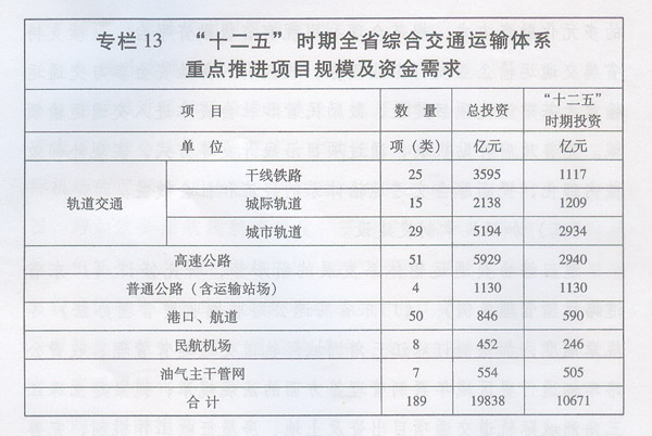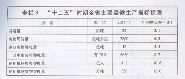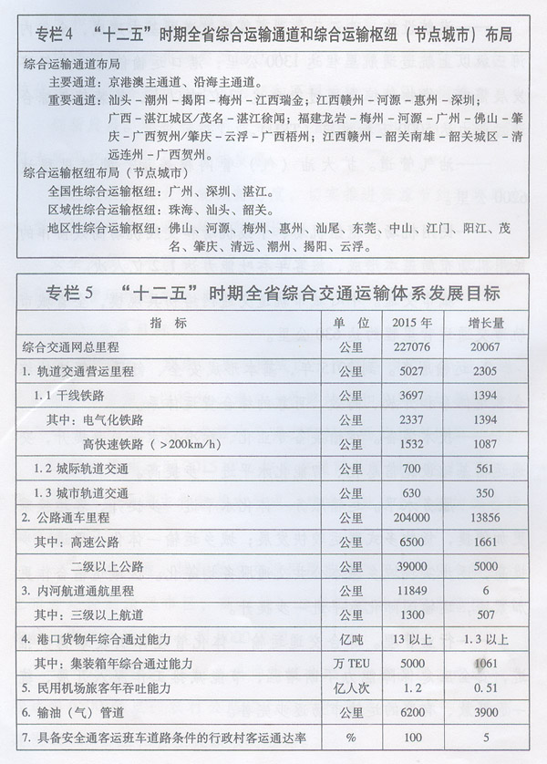 二、指導(dǎo)思想和發(fā)展目標(biāo) (一)指導(dǎo)思想。 以鄧小平理論和“三個(gè)代表”重要思想為指導(dǎo),深入貫徹落實(shí)科學(xué)發(fā)展觀,以轉(zhuǎn)變交通運(yùn)輸發(fā)展方式為主線,以調(diào)結(jié)構(gòu)、增能力、促銜接、降成本、重效益為主導(dǎo),進(jìn)一步處理好速度、質(zhì)量和效益的關(guān)系,有效整合各種交通運(yùn)輸資源,構(gòu)建便捷、安全、高效、綠色的綜合交通運(yùn)輸體系,實(shí)現(xiàn)由通道建設(shè)為主向通道與樞紐建設(shè)并舉轉(zhuǎn)變,由建設(shè)為主向建設(shè)與服務(wù)并舉轉(zhuǎn)變,由要素投入為主向要素投入、科技進(jìn)步和體制機(jī)制創(chuàng)新并舉轉(zhuǎn)變,逐步實(shí)現(xiàn)各種運(yùn)輸方式相互協(xié)調(diào)、一體化發(fā)展,為“加快轉(zhuǎn)型升級(jí)、建設(shè)幸福廣東”提供強(qiáng)有力的交通保障。 (二)發(fā)展原則。 適度超前。著眼于未來(lái)更遠(yuǎn)時(shí)期,實(shí)現(xiàn)運(yùn)輸供給能力和服務(wù)水平適度超前于客貨運(yùn)輸需求。 公交優(yōu)先。加快發(fā)展快速大運(yùn)量公共交通,提高公共交通線網(wǎng)密度和站點(diǎn)覆蓋率,增加公共交通出行比重。 協(xié)調(diào)發(fā)展。優(yōu)化調(diào)整運(yùn)輸結(jié)構(gòu),充分發(fā)揮各種運(yùn)輸方式的比較優(yōu)勢(shì),注重各種運(yùn)輸方式內(nèi)部和不同運(yùn)輸方式間的銜接。 創(chuàng)新發(fā)展。積極推進(jìn)科技創(chuàng)新、管理創(chuàng)新和體制機(jī)制創(chuàng)新,努力實(shí)現(xiàn)交通運(yùn)輸又好又快發(fā)展。 綠色發(fā)展。加大節(jié)能減排力度,切實(shí)推進(jìn)資源節(jié)約和環(huán)境友好型的低碳綠色交通運(yùn)輸系統(tǒng)建設(shè)。 安全發(fā)展。牢固樹立“以人為本”、“安全第一”的思想,強(qiáng)化安全管理和應(yīng)急保障。 (三)發(fā)展目標(biāo)。 到“十二五”期末,基本建成以干線鐵路和城際軌道交通、高速公路為骨架,以機(jī)場(chǎng)、港口、鐵路站場(chǎng)和公路站場(chǎng)等運(yùn)輸樞紐為節(jié)點(diǎn),各種運(yùn)輸方式層次分明、銜接順暢的綜合運(yùn)輸網(wǎng)絡(luò)。 1.基礎(chǔ)設(shè)施。到2015年,綜合交通網(wǎng)總里程約達(dá)22.7萬(wàn)公里,綜合運(yùn)輸通道主骨架基本形成。建成一批服務(wù)高效的綜合運(yùn)輸樞紐。 ——軌道交通。城際軌道交通網(wǎng)覆蓋珠江三角洲9個(gè)地級(jí)以上市并延伸到清遠(yuǎn)市區(qū),高(快)速鐵路貫通東西北地區(qū),全省軌道交通營(yíng)運(yùn)里程達(dá)到5000公里。 ——公路網(wǎng)絡(luò)。實(shí)現(xiàn)縣縣通高速公路,全省高速公路通車?yán)锍踢_(dá)到6500公里;農(nóng)村公路通行能力和服務(wù)水平進(jìn)一步提高,建設(shè)25000公里社會(huì)主義新農(nóng)村公路。 ——港航設(shè)施。珠江三角洲高等級(jí)航道網(wǎng)基本建成,全省內(nèi)河三級(jí)以上航道通航里程達(dá)1300公里;港口運(yùn)輸能力適應(yīng)經(jīng)濟(jì)發(fā)展需求,貨物年綜合通過(guò)能力達(dá)13億噸以上,集裝箱年綜合通過(guò)能力達(dá)5000萬(wàn)標(biāo)準(zhǔn)箱(TEU)。 ——油氣管道。擴(kuò)大油(氣)管網(wǎng)覆蓋面,管道里程達(dá)6200公里。 ——民用機(jī)場(chǎng)。樞紐機(jī)場(chǎng)、干線機(jī)場(chǎng)和支線機(jī)場(chǎng)高效協(xié)作的民用機(jī)場(chǎng)布局基本形成,旅客年吞吐能力達(dá)12億人次。 ——城市交通。中心城市軌道交通網(wǎng)絡(luò)初具規(guī)模,全省城市軌道交通運(yùn)營(yíng)里程約達(dá)630公里。 2.運(yùn)輸服務(wù)。到2015年,基本形成安全、舒適、便捷的綜合客運(yùn)體系和開放、高效、可靠的綜合貨運(yùn)體系。 ——技術(shù)裝備。運(yùn)輸裝備專業(yè)化、標(biāo)準(zhǔn)化水平顯著提升,交通運(yùn)輸基礎(chǔ)設(shè)施信息化、智能化水平進(jìn)一步提高。 ——服務(wù)水平。運(yùn)輸服務(wù)一體化水平進(jìn)一步提升,客運(yùn)換乘更加便捷,貨物多式聯(lián)運(yùn)較快發(fā)展;城鄉(xiāng)運(yùn)輸一體化水平進(jìn)一步提高,逐步實(shí)現(xiàn)城鄉(xiāng)基本公共交通服務(wù)均等化。區(qū)域運(yùn)輸合作更加緊密,運(yùn)輸國(guó)際化水平進(jìn)一步提升。 ——行業(yè)管理。綜合交通運(yùn)輸一體化管理體制改革穩(wěn)步推進(jìn),安全應(yīng)急保障能力不斷增強(qiáng),節(jié)能減排工作深入開展,統(tǒng)一、開放、有序的運(yùn)輸市場(chǎng)逐步完善。 ?