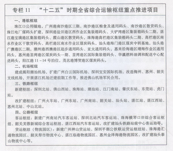 (二)強(qiáng)化綜合運(yùn)輸樞紐建設(shè)。 結(jié)合軌道交通網(wǎng)、高速公路網(wǎng)和機(jī)場(chǎng)、港口建設(shè),加強(qiáng)節(jié)點(diǎn)城市綜合運(yùn)輸樞紐建設(shè),在廣州、深圳和湛江等全國(guó)性綜合運(yùn)輸樞紐城市,珠海、汕頭和韶關(guān)等區(qū)域性綜合運(yùn)輸樞紐城市以及其他地區(qū)性綜合運(yùn)輸樞紐城市布局建設(shè)綜合運(yùn)輸樞紐站場(chǎng),使各種運(yùn)輸方式有效銜接,并與城市規(guī)劃相協(xié)調(diào),與城市建設(shè)相促進(jìn)。 1.機(jī)場(chǎng)樞紐。完善以廣州白云國(guó)際機(jī)場(chǎng)為國(guó)際復(fù)合型門戶樞紐,深圳寶安國(guó)際機(jī)場(chǎng)為區(qū)域性樞紐機(jī)場(chǎng),其他支線機(jī)場(chǎng)為補(bǔ)充的全省民用機(jī)場(chǎng)布局,加強(qiáng)廣州白云國(guó)際機(jī)場(chǎng)的國(guó)際航空樞紐建設(shè),提升深圳寶安國(guó)際機(jī)場(chǎng)國(guó)內(nèi)客運(yùn)和國(guó)際貨運(yùn)功能,加快支線機(jī)場(chǎng)建設(shè)。強(qiáng)化機(jī)場(chǎng)綜合運(yùn)輸樞紐功能,繼續(xù)加快建設(shè)廣州白云國(guó)際機(jī)場(chǎng)和深圳寶安國(guó)際機(jī)場(chǎng)城際、城市軌道交通接入工程;在廣州白云國(guó)際機(jī)場(chǎng)、深圳寶安國(guó)際機(jī)場(chǎng)和揭陽(yáng)潮汕機(jī)場(chǎng)配套完善公路客運(yùn)和公交站場(chǎng);建成聯(lián)系珠海三灶、揭陽(yáng)潮汕等機(jī)場(chǎng)的高(快)速公路;完善深圳寶安國(guó)際機(jī)場(chǎng)水運(yùn)碼頭功能;研究遷建湛江機(jī)場(chǎng)。加快通用航空機(jī)場(chǎng)布點(diǎn)與建設(shè),構(gòu)建全省通航服務(wù)網(wǎng)絡(luò)、海洋綜合服務(wù)網(wǎng)絡(luò)和航空應(yīng)急救援網(wǎng)絡(luò)。 2.港航樞紐。推進(jìn)港口資源整合,促進(jìn)沿海港口集約化發(fā)展和港口群協(xié)調(diào)發(fā)展。進(jìn)一步加強(qiáng)集裝箱、煤炭、礦石、油品和糧食等專業(yè)化泊位建設(shè),提高煤炭接卸碼頭靠泊能力和接卸效率,根據(jù)產(chǎn)業(yè)布局要求相應(yīng)建設(shè)原油接卸碼頭,繼續(xù)完善集裝箱干線港、支線港和喂給港布局,形成高效率的內(nèi)貿(mào)、外貿(mào)集裝箱運(yùn)輸體系。大力發(fā)展公用碼頭,鼓勵(lì)企業(yè)專用碼頭提供社會(huì)化服務(wù),提升港口公共服務(wù)水平和岸線資源的使用效率。全面推進(jìn)傳統(tǒng)港口升級(jí)改造,提高港口岸線資源利用率。完善港口集疏運(yùn)體系,發(fā)展多式聯(lián)運(yùn),實(shí)現(xiàn)沿海重要港口通鐵路、高等級(jí)公路。加強(qiáng)陸島碼頭、防波堤、公共錨地等公共基礎(chǔ)設(shè)施建設(shè)。在珠江三角洲沿海港口科學(xué)選址,擇機(jī)建設(shè)郵輪母港,促進(jìn)郵輪運(yùn)輸服務(wù)業(yè)發(fā)展。 3.鐵路樞紐。加強(qiáng)鐵路和城際軌道交通綜合樞紐站場(chǎng)建設(shè),在鐵路和城際軌道交通客運(yùn)站配套建設(shè)公路客運(yùn)、公交站場(chǎng)和城市軌道交通站場(chǎng),與公路、城市軌道交通、城市公交等實(shí)現(xiàn)便捷銜接。圍繞城市空間布局和產(chǎn)業(yè)發(fā)展,加強(qiáng)鐵路綜合貨運(yùn)樞紐站場(chǎng)建設(shè),充分發(fā)揮鐵路在港口貨物集散中的作用,提高貨物多式聯(lián)運(yùn)效率。 4.公路樞紐。組織實(shí)施廣(州)佛(山)、深(圳)(東)莞以及珠海、汕頭、韶關(guān)、梅州、江門、湛江、茂名、肇慶等10個(gè)國(guó)家公路運(yùn)輸樞紐總體規(guī)劃。新建、改擴(kuò)建一批公路客運(yùn)樞紐站場(chǎng),加強(qiáng)公路客運(yùn)樞紐與軌道交通、城市公交等運(yùn)輸方式的銜接,進(jìn)一步提高公路客運(yùn)樞紐站場(chǎng)的服務(wù)水平和覆蓋面。結(jié)合產(chǎn)業(yè)結(jié)構(gòu)布局,積極推進(jìn)公路貨運(yùn)樞紐站場(chǎng)和現(xiàn)代化物流園區(qū)建設(shè),提升物流服務(wù)水平。