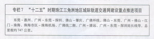 城際軌道交通。建成以廣州、深圳、珠海為主要節(jié)點(diǎn),連通珠江三角洲9個(gè)地級(jí)以上市及清遠(yuǎn)市區(qū)的珠江三角洲城際軌道交通網(wǎng)絡(luò)主骨架,便利銜接鐵路客運(yùn)樞紐站、主要機(jī)場(chǎng)、城市軌道交通樞紐站、公路客運(yùn)樞紐站,實(shí)現(xiàn)以廣州為中心、主要城市間1小時(shí)互通。規(guī)劃建設(shè)粵東地區(qū)城際軌道交通網(wǎng)。到2015年,珠江三角洲城際軌道交通營(yíng)運(yùn)里程約700公里。