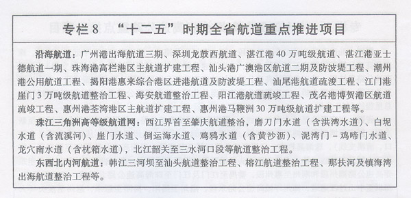 2.積極推進(jìn)航道建設(shè)。大力發(fā)展內(nèi)河航運(yùn),改善全省航道等級(jí)結(jié)構(gòu)和通達(dá)水平。加大內(nèi)河出??陂T航道開發(fā)力度,實(shí)施西江航運(yùn)干線擴(kuò)能工程,進(jìn)一步完善珠江三角洲高等級(jí)航道網(wǎng),基本形成西江干線至珠江口港口群的航運(yùn)主通道;將珠江三角洲高等級(jí)航道網(wǎng)逐步向清遠(yuǎn)、韶關(guān)延伸,抓緊整治北江韶關(guān)至三水河口段千噸級(jí)航道;組織實(shí)施榕江、韓江航道整治工程。全力推進(jìn)內(nèi)河水運(yùn)發(fā)展方式轉(zhuǎn)變,提高內(nèi)河水運(yùn)發(fā)展質(zhì)量和效益,形成航道、港口、船舶和航運(yùn)支持保障系統(tǒng)協(xié)調(diào)發(fā)展、功能完善、技術(shù)先進(jìn)、運(yùn)轉(zhuǎn)高效的內(nèi)河水運(yùn)體系。